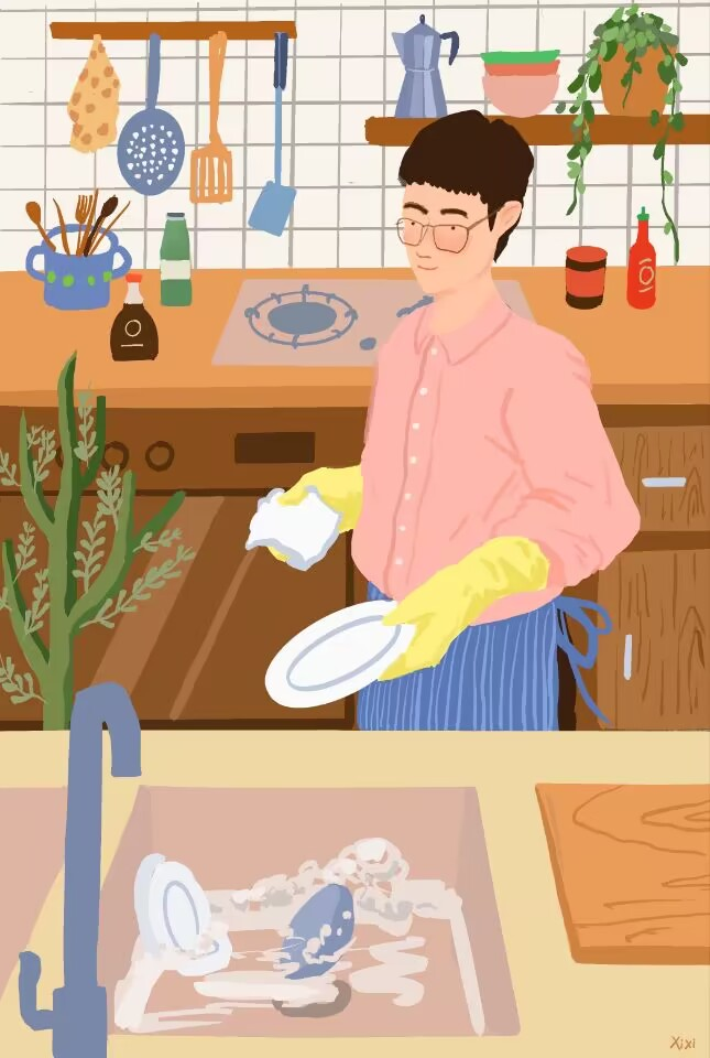 在《劳动使人快乐》这幅作品中,陈希用插画的形式描绘了一个在平常不过的在家中洗碗的场景。色彩方面以高纯度且色彩丰富的颜色对画面进行组合,采用温暖的整体色调,意欲表现劳动过程中所产生的情感是欢快的,积极向上的;构图方面以厨房为背景,将人物居于正中偏右,直接的表达了主题:洗碗的劳动场景;风格方面采用了偏平面的绘画语言对整个场景进行描绘,能够给人一种简单、几何化平面化而不乏趣味性的视觉感受,并在形象方面对人物、物品形象进行一定平面插画语言的处理。