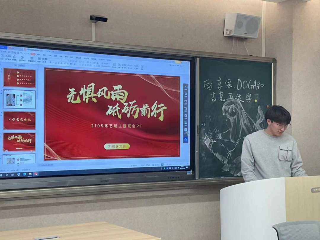 环艺班开展了以“无惧风雨,砥砺前行”为主题的班会,通过讲述在建设新时代道路上不惧险阻、克服万难、砥砺前行的英雄故事,激发出勇担民族复兴大任的责任意识,同学们纷纷表示将不辱时代使命,做新时代的奋斗者,为实现两个一百年奋斗目标、实现中华民族伟大复兴的中国梦不断努力。