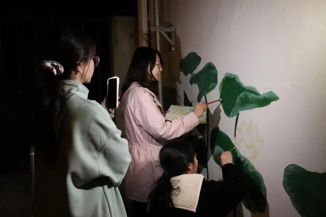 天空逐渐被夜色笼罩,半月熠熠生辉,便有同学主动打开手电筒照明,保证夜晚绘制工作的效率。晚间收工,徐月梅指挥大家捡拾垃圾,清洗画笔,整理工具,以身作则践行美丽乡村的倡导。驱车回到酒店,各小组又集中讨论了接下来的分工与进程,安排妥当后分别回房休息。