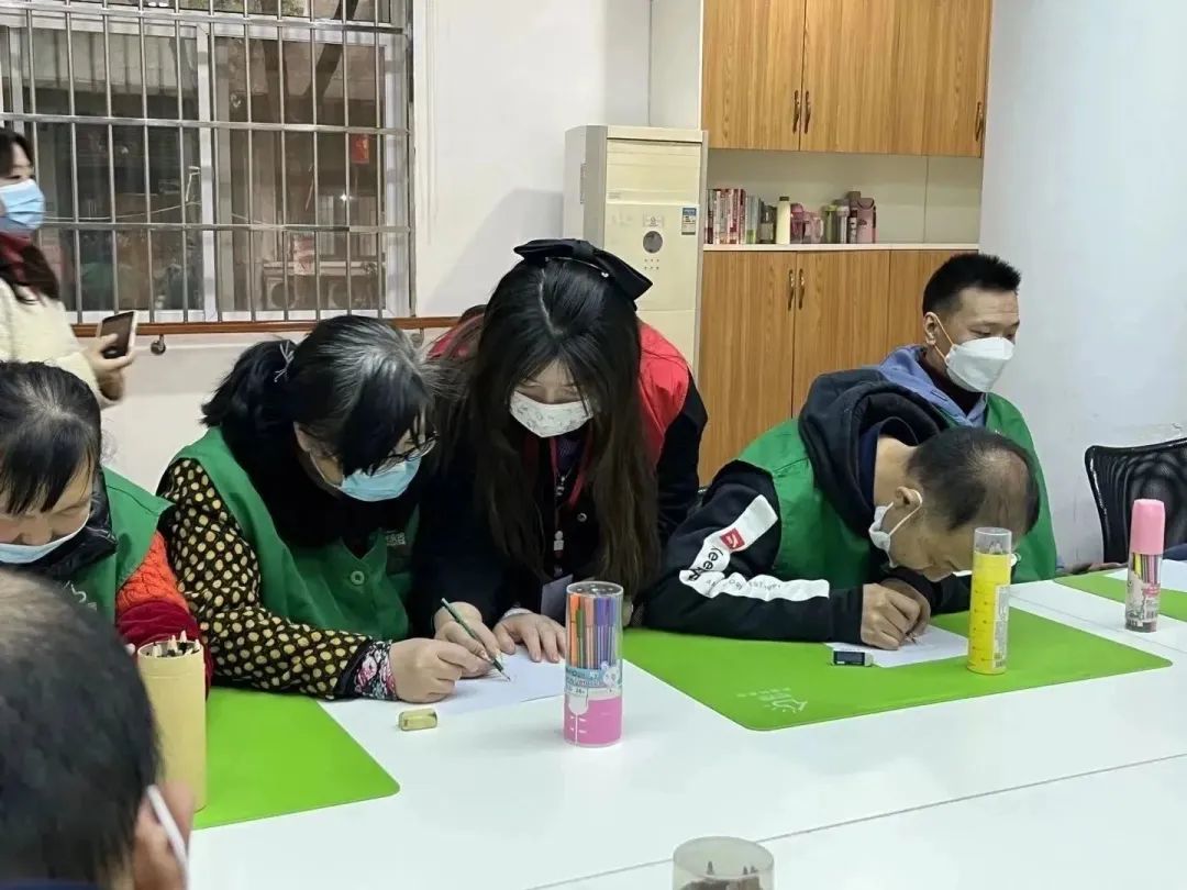 学员们跟随示范,一笔一划地模仿作画,在遇到困难时举手示意,志愿者们随即热情上前,提供帮助,并对他们进行鼓励。在填色环节,学员们发挥自己的想象,作出色彩丰富、各具特点的画作,得到志愿者的认可和表扬。