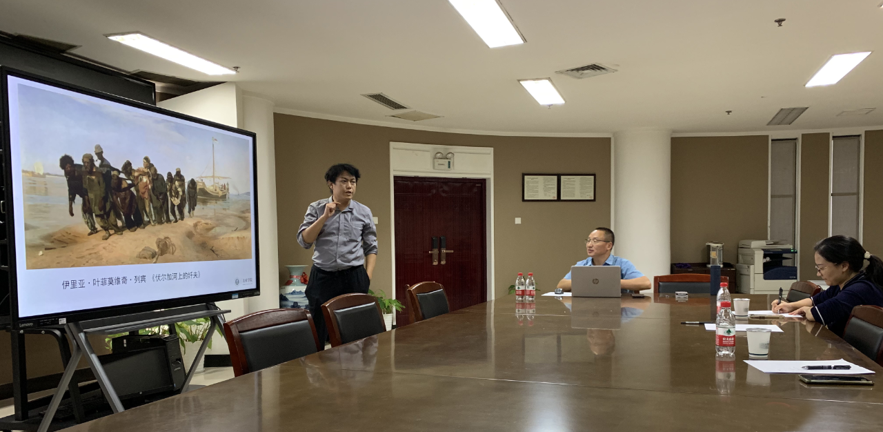 徐谦赏析的是帕勃洛·鲁伊斯·毕加索《格尔尼卡》。他结合自己曾在西班牙博物馆现场观赏原作的切身感受,并结合国际社会形势,充分阐释了画作的内容、创作背景、表现手法,深入阐明了战争给人类带来的灾难的主题立意。王成武则对王羲之《兰亭序》(冯承素摹本)进行赏析。他绘声绘色地诠释了“天下第一行书”《兰亭序》的写作背景、文章内容、字体结构、章法变化和笔法特点,对王羲之的创作情感进行了深度剖析,深刻揭示了作品的审美取向和价值。张聃赏析的是伊里亚·叶菲莫维奇·列宾创作的《伏尔加河上的纤夫》。他详解了作品创作背景、主题和构图,描述了奋力拉纤的纤夫群像,对作品中人物的形态和情感进行了逐一解读,对下层人民群众悲惨生活寄予了深切的同情。