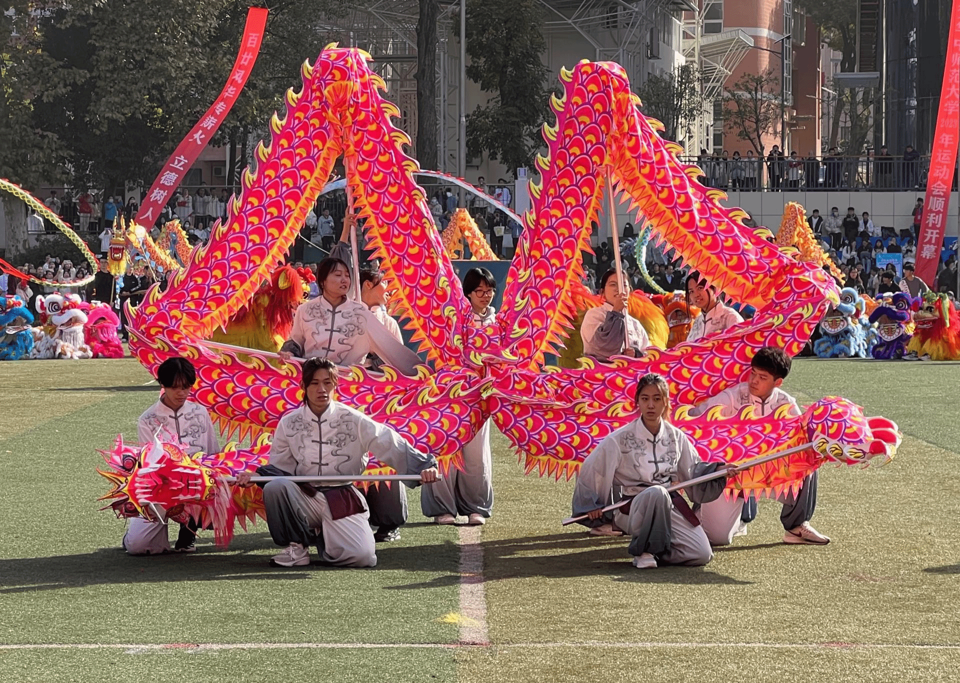 11月17日上午开幕式上,学校的舞龙队进行了精彩的助威表演,美术学院(后文简称”美院“)的舞龙队也穿梭其中,一条粉色长龙在锣鼓声中翻腾起舞,时而翻转、时而跃动、时而俯冲,变化万千,摆出各种灵动的造型。美院学子身体力行传承中华传统文化,展示出无限创意,充满了旺盛的生命力,给人耳目一新之感,精彩的表演引得观众的阵阵掌声和欢呼声,将开幕式推向高潮。辛勤磨炼,挥汗如雨,将体育精神融入美院风采;齐心协力,超越自我,将挑战精神植入艺术血脉。