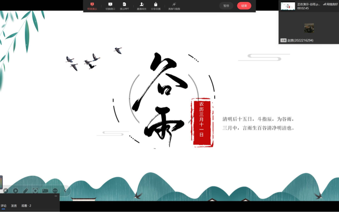 华大青年讯(通讯员 杨立坤 赵茜 刘蓝泽 李宗炎)4月15日上午,一场以“春雨润笔绘新篇,谷雨传情筑家园”为主题的线上直播绘画教学课在紫阳街如期进行。本次教学活动由志愿者赵茜和李宜珊同学精心策划并主讲。志愿者们希望能够通过艺术的形式,引导学员们探寻节气的奥秘、感受时令的变迁、体会艺术的乐趣。