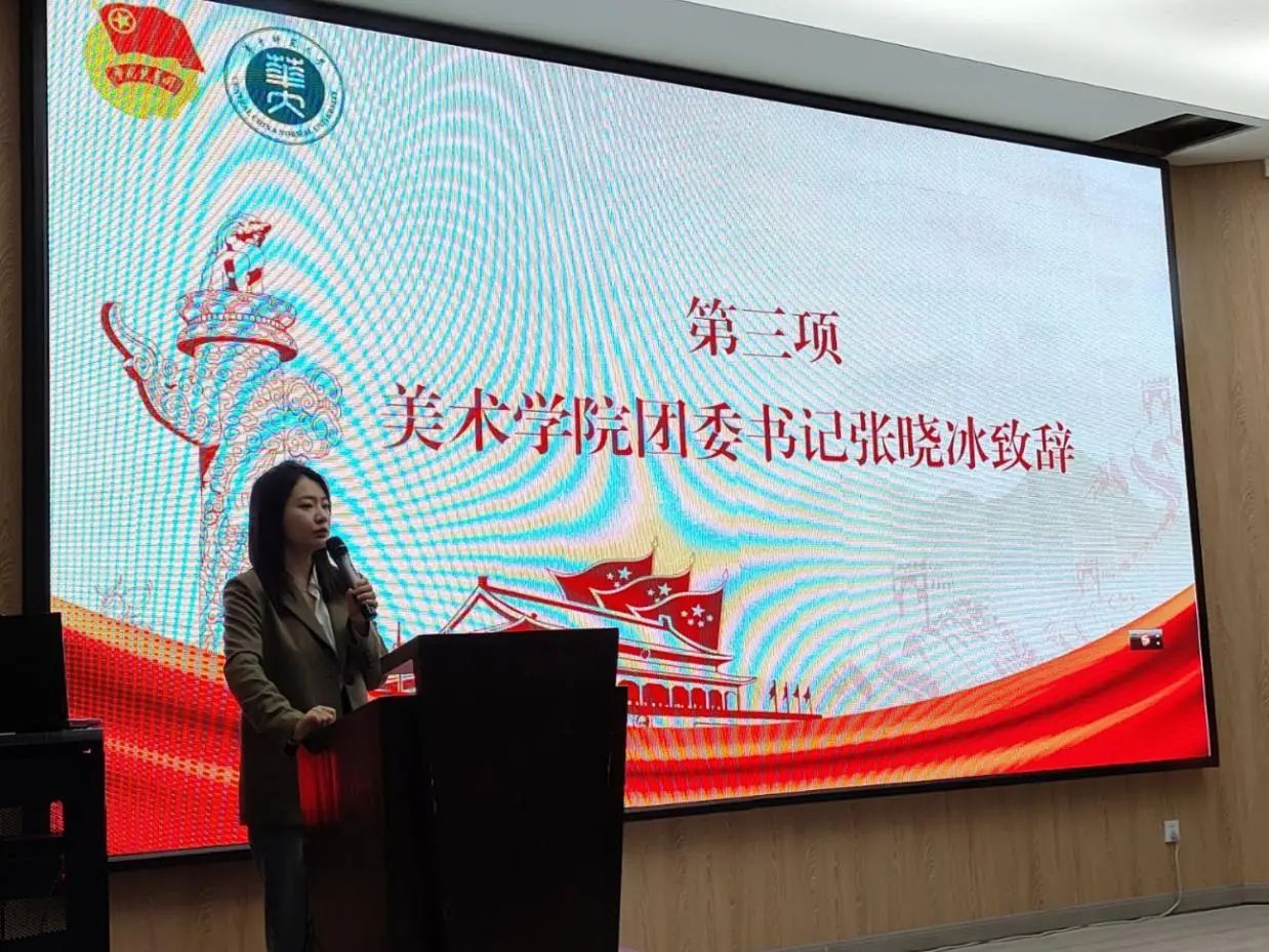 活动伊始,全体师生起立齐唱国歌。典礼第二项,美术学院团委书记张晓冰介绍本次青马工程的课程方案,同时围绕“守正”与“创新”两个主题对本次团干培训提出要求与期望,她强调团学骨干们要在机构设置与工作交接中继承优良传统,在培训内容与活动形式中创新探索,在继往开来与奋勇前行中不忘初心。最后,张晓冰指出,希望同学们以饱满热情、满格状态、扎实技能凝心聚力,服务同学成长成才,助力美术学院事业发展,肩负起时代赋予的崇高使命和社会责任,为实现中华民族伟大复兴的中国梦不懈奋斗。
