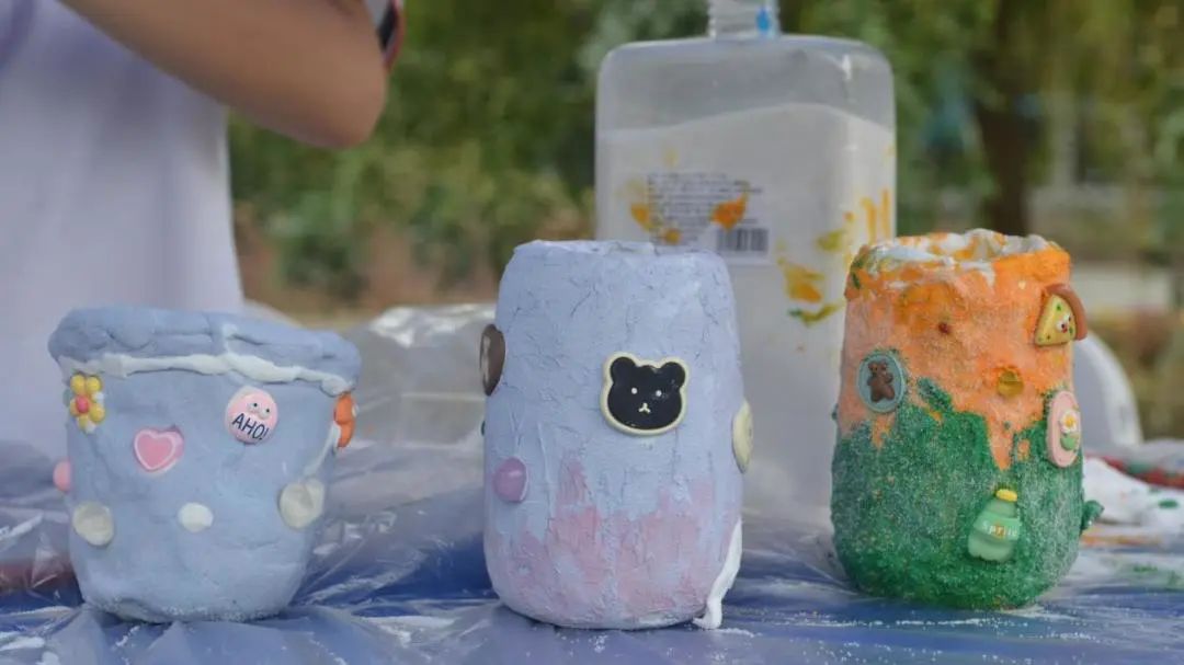 在实践互动区里,现场气氛热烈,同学们热情高涨,纷纷参与进各项活动中。传统非遗漆扇以“一半人为,一半天成”的特点大受欢迎,同学们纷纷亲自动手制作独一无二的漆扇;废纸杯、毛线球、粘土摇身一变,在同学们手中成了宝石花瓶、纸杯花篮......同学们在自行制作过程中不仅提升了自身的艺术素养,还将环保意识内化于心、外化于行。