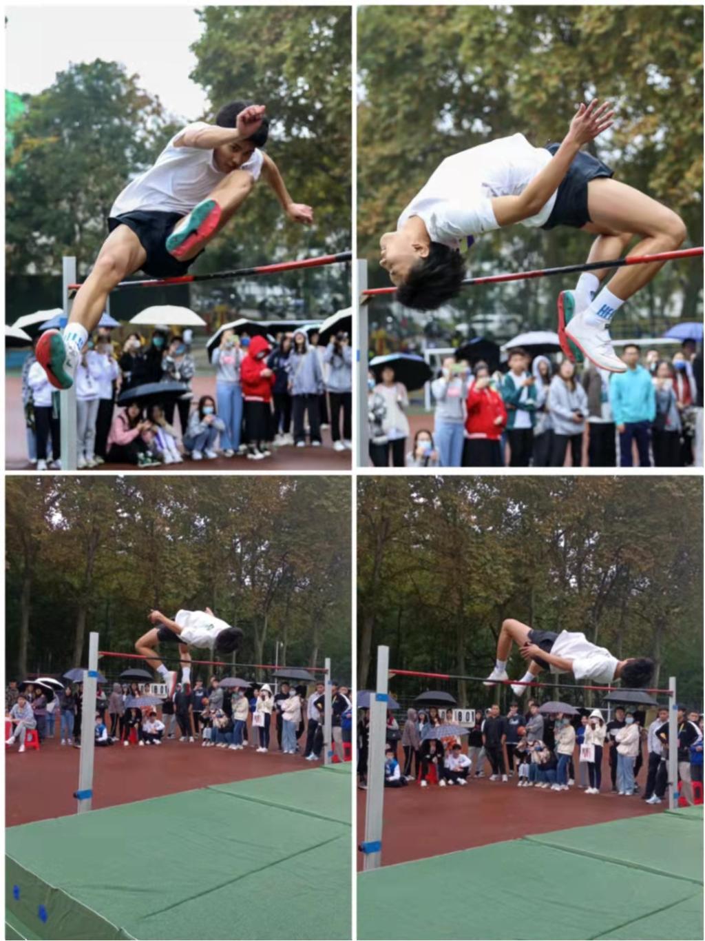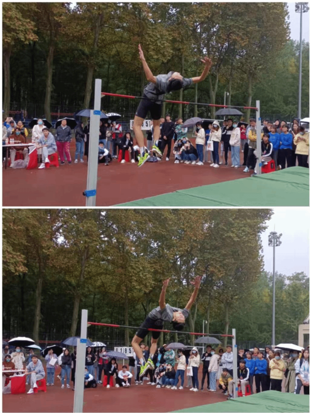 由于个别因素影响,体院组与学生组合并,于九点五十五分进行跳高比赛。当高度升到165cm时,场上的体院组运动员只剩下刘智勇、巩旭和张倍铭,而学生组最后两名运动员也将自己的成绩最终定格在了165cm。天空下着淅淅沥沥的小雨,为了保持温度,拉开肌肉,避免受伤,场上的三名运动员不断地进行着热身。场地虽然湿滑,但运动员克服困难,成功突破170cm、175cm和180cm三个高度。可惜的是,在高度升到185cm时,张倍铭在多次试跳后遗憾落败,获得跳高决赛男子组季军。
