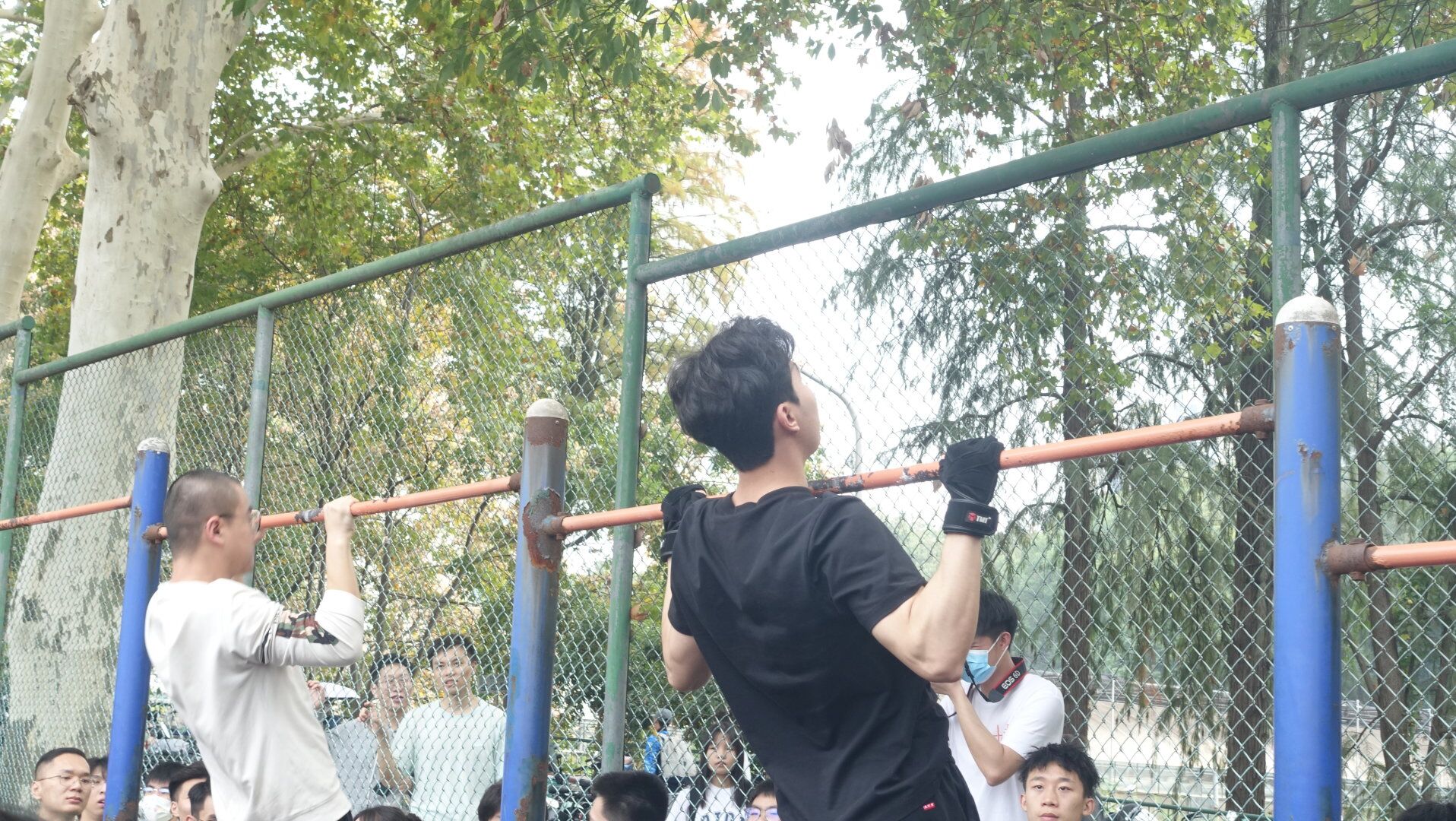 高低错落的单杠前,法学院选手有序排队,关注着最先上场的两位同学,等待着裁判的哨声。场边围观的同学也期待着运动员的精彩表现。而场上的同学则抬头望着眼前的单杠,为比赛做着最后的准备。随着裁判一声令下,两人同时向上奋力一跃,两手紧紧抓握单杠,双臂发力,露出结实有力的臂膀,腿蹬如笔直的杨树。教科书级别的引体向上动作引来围观同学一片惊呼。接着运动员舒展身体,缓缓卸力,以整个人挂在横杆上如倒生的枝干,纹丝不动。他们的眼神里透露出坚定和自信。1,2……15!全场的欢呼声属于他们!两位“先锋”的表现为其他同学树立了榜样、鼓舞了士气。法院健儿无一人缺席,他们拼尽最大的努力,为法学院贡献自己的一份力量,最终取得了佳绩——以195的总数斩获全校第七名。这是对法学院学子们敢上敢拼、奋力拼搏精神的最好嘉奖。