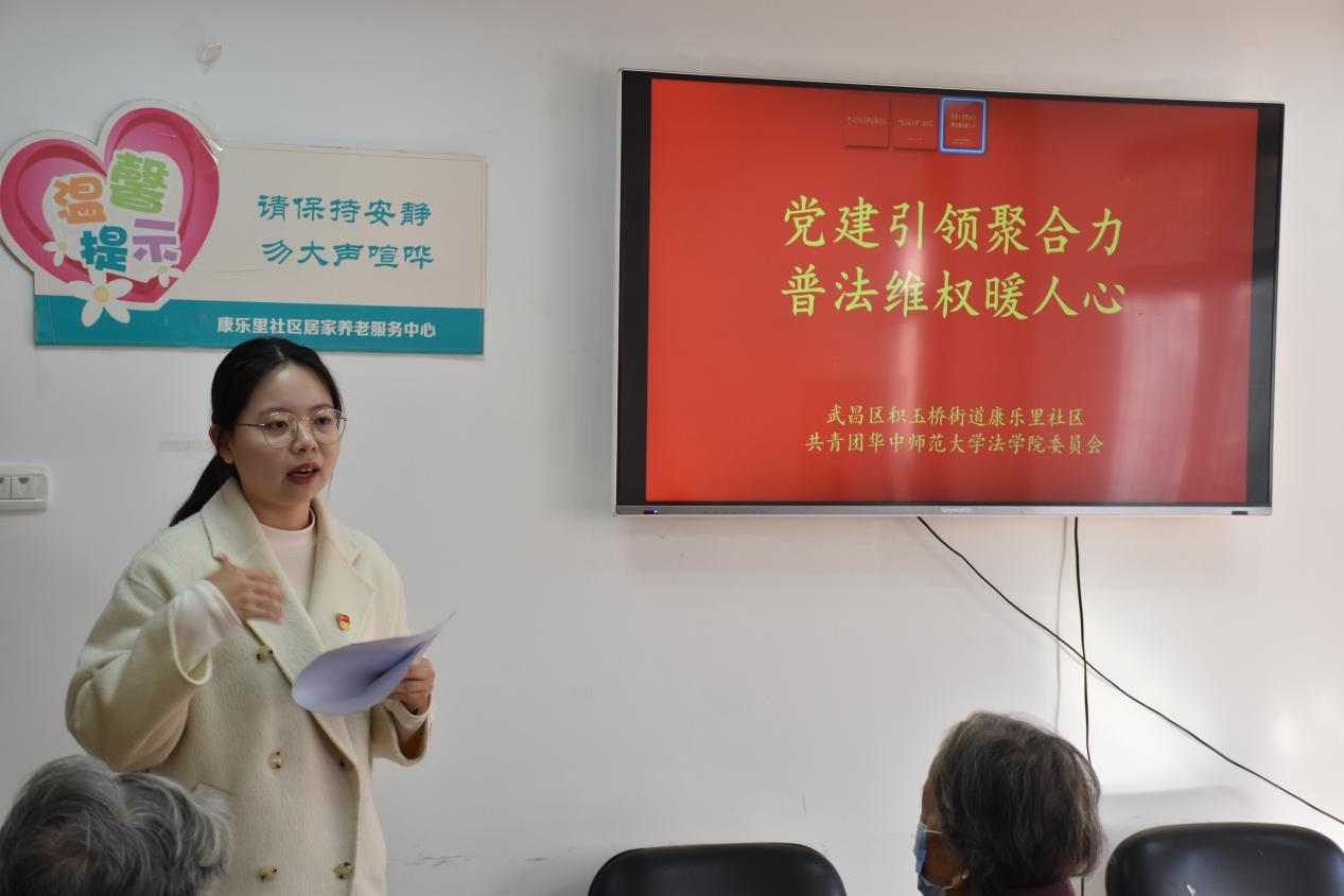 华大青年讯(通讯员 常学婧 刘澳莲)为贯彻落实大学生社区实践计划,引导青年走进基层,了解社会实际、增强社会责任感,法学院积极响应号召,组织学院团学骨干、青年志愿者到结对社区开展志愿服务活动。12月11日,法学院研究生团总支、华中师范大学恽代英法治宣讲团一行赴武昌区康乐里社区开展十二月主题党日活动。本次活动以防诈宣传的形式,携手社区共创党建新篇章。