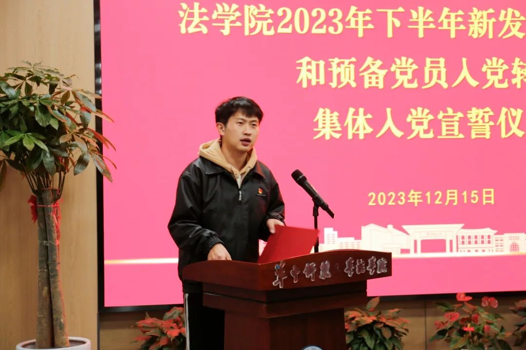 华大青年讯(通讯员 张永基 冯珊珊)为深入学习贯彻习近平新时代中国特色社会主义思想和党的二十大精神,12月15日上午,法学院党委于法学院一楼大厅为新发展的21名预备党员和10名转正的预备党员举行集体入党宣誓仪式。法学院党委书记杨臣,党务干事秦亚琼,宣传干事、团委书记张永基,本科党支部书记、团委副书记姜孝文出席宣誓仪式。法学院党委副书记万枞主持本次仪式。