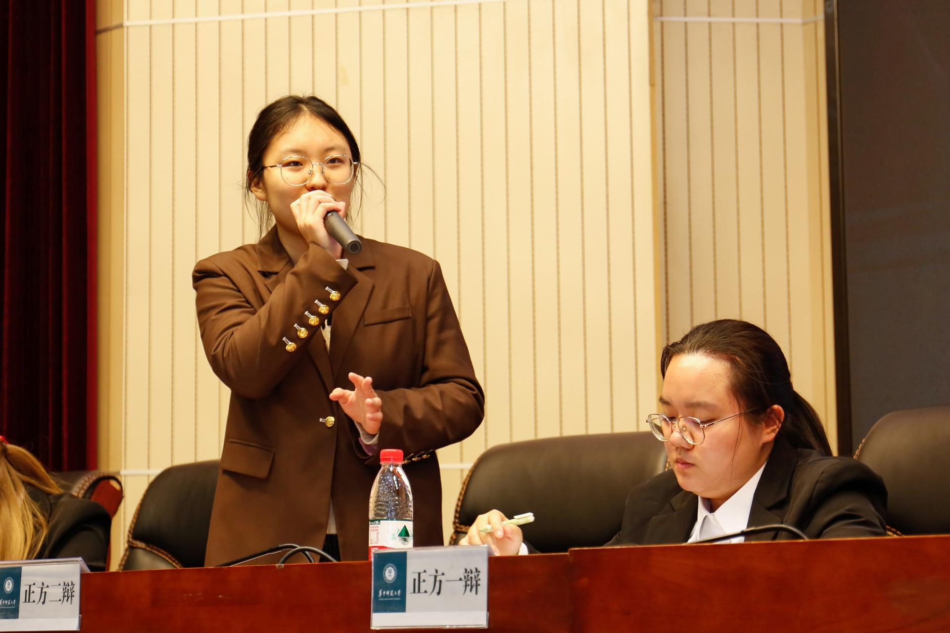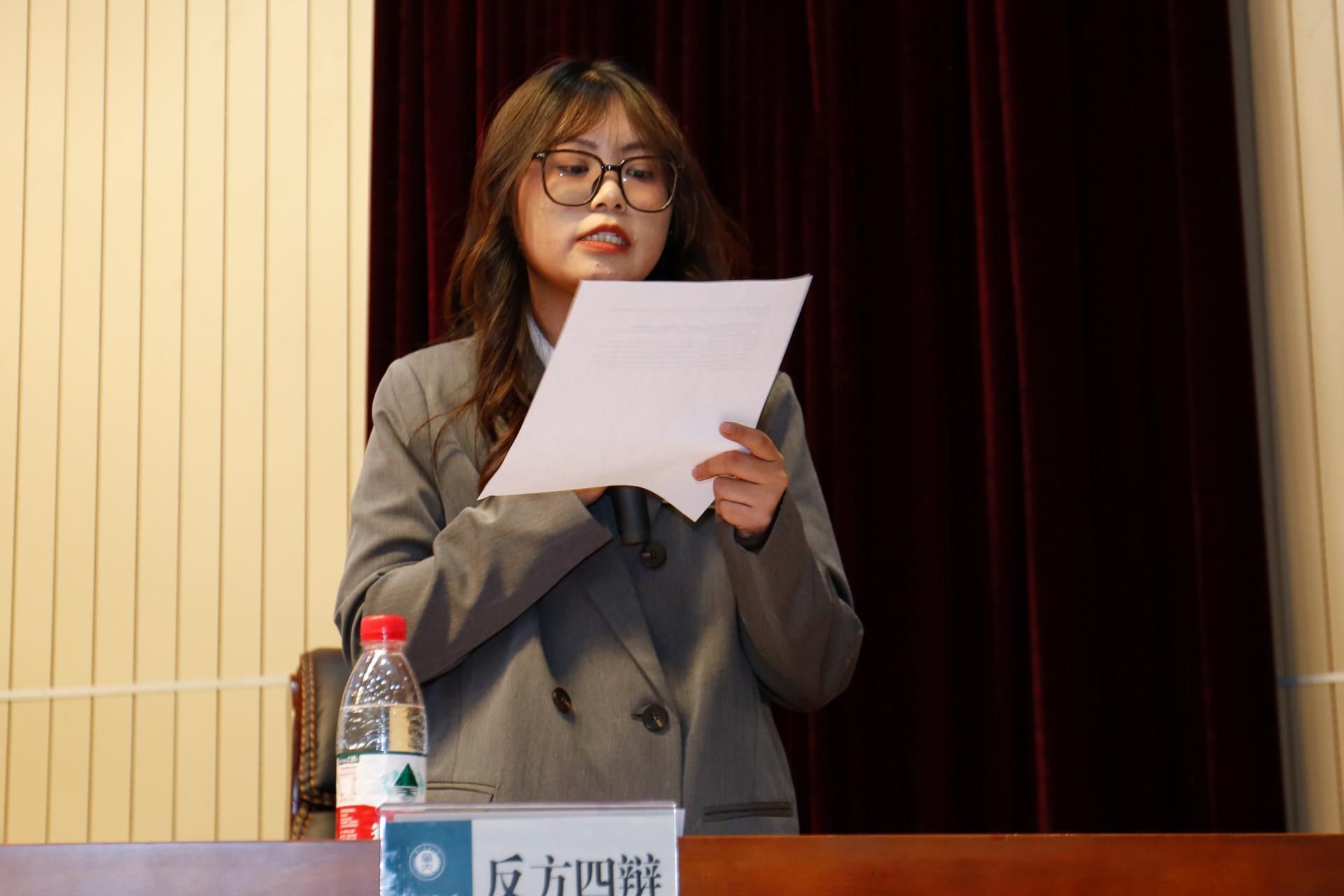 比赛正式开始,首先由双方一辩进行立论。张晓兰以著作权内容以及版权有限主义和无限主义的对立作为切入点,从长版权有利于保护著作人身权和著作财产权两方面阐述观点,完成正方立论。黄文轩则以“长版权不能适应数字化时代文化领域的迭代速度,长版权使文化资本更多地垄断市场,降低文化产品的质量”作为反方立论观点。双方立论均逻辑清晰,有理有据,环环相扣,为己方后续论证奠定良好基调。