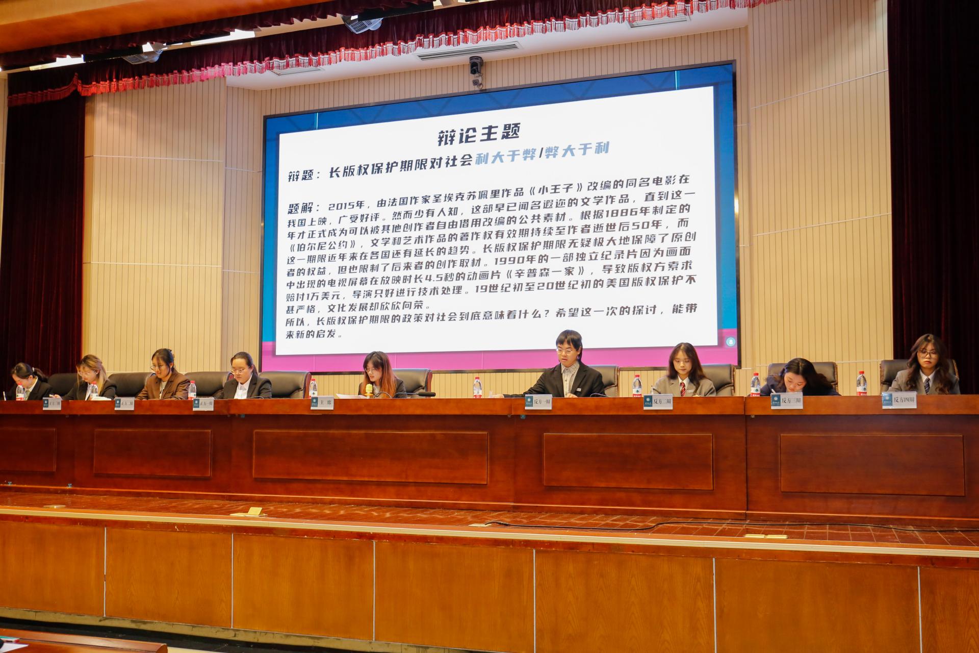 本次决赛由法学院辩论队(正方)对阵文学院辩论队(反方),辩题为“长版权保护期限对社会利大于弊/弊大于利”。代表法学院辩论队参赛的辩手分别为一辩张晓兰、二辩丛梓烨、三辩谢萌和四辩王卓,代表文学院辩论队参赛的是一辩黄文轩、二辩林嘉仪、三辩李芷萱和四辩张碧榕。