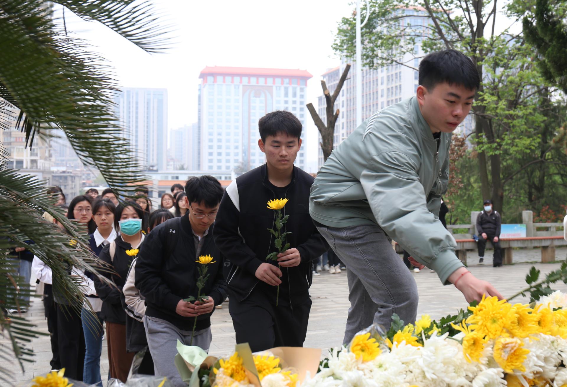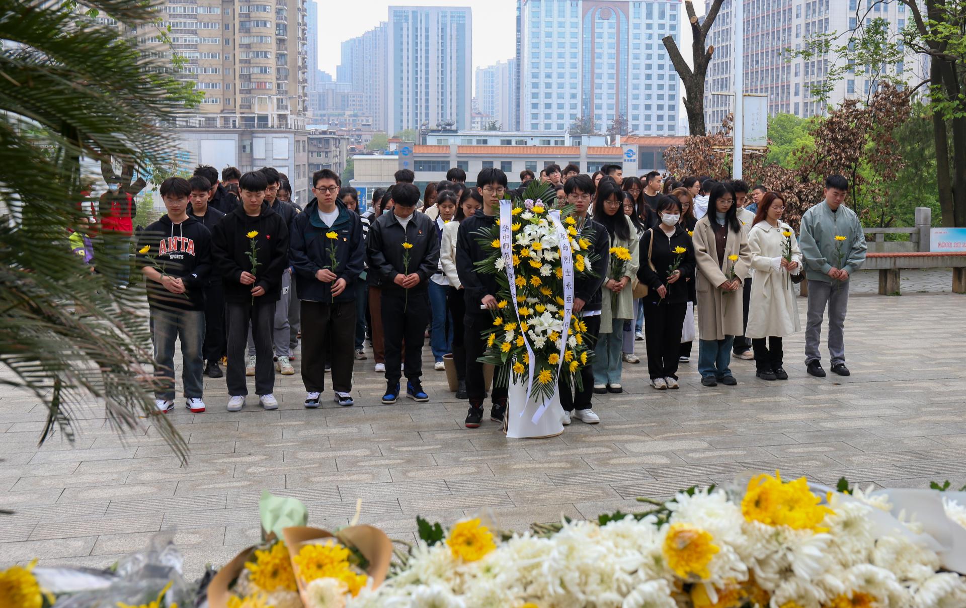 接下来,在场的共产党员和共青团员面向党旗、团旗,庄严重温入党誓词、入团誓词,表达了对革命精神的铭记和传承。来自“青马工程”培养班的成员代表董升发言,表达了对烈士的哀思以及继承先辈遗志的决心。随后,在场师生怀着无比崇高的敬意,一个接一个走向施洋烈士纪念碑,将鲜花敬献并深深鞠躬,以此缅怀烈士的英勇事迹和革命精神。
