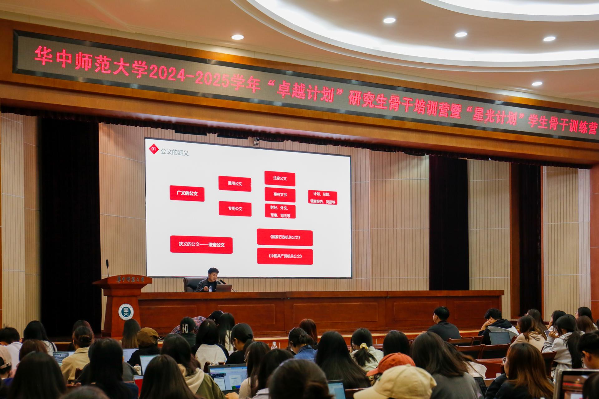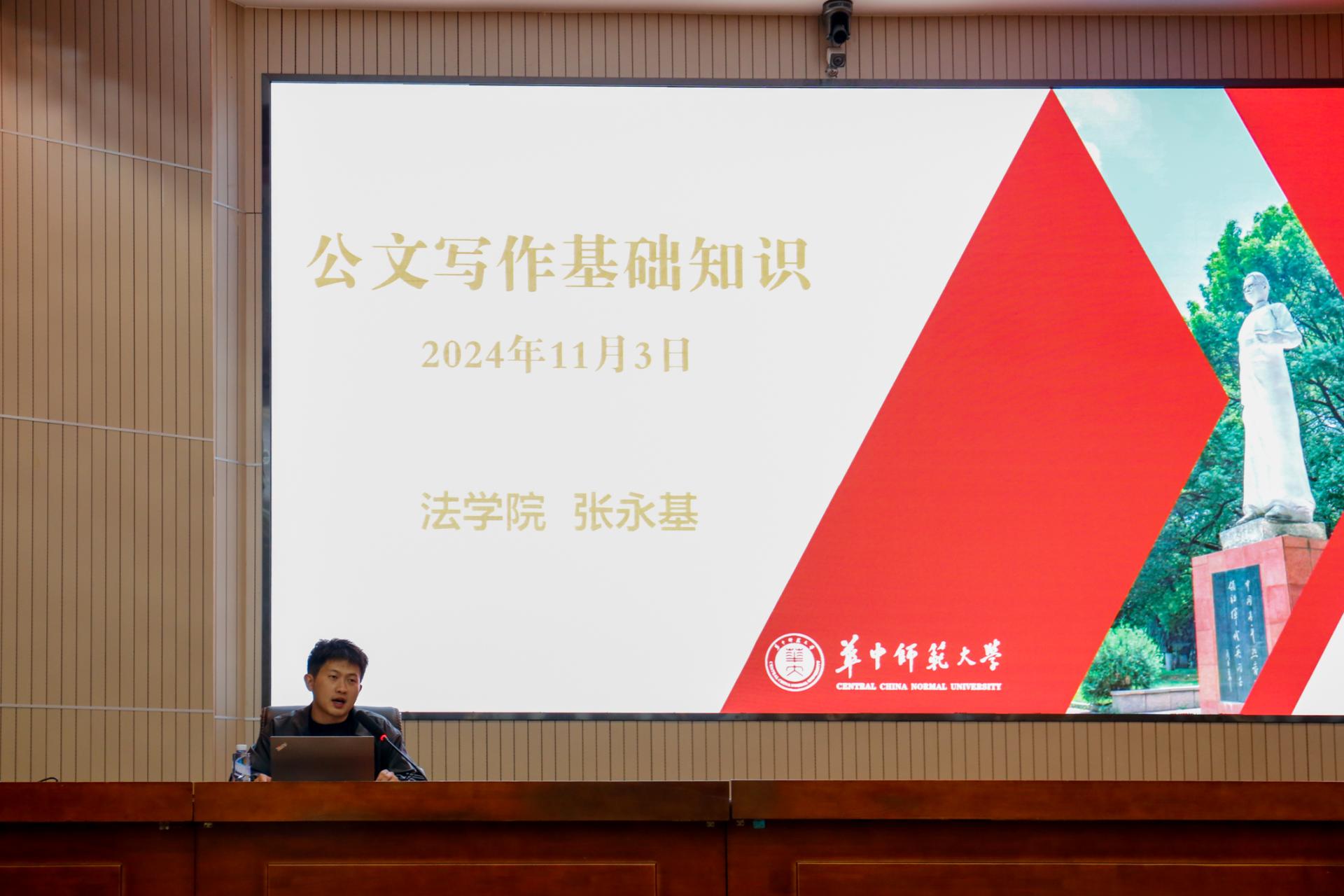 华大青年讯(通讯员 张宇杰 李顺)11月3日,华中师范大学2024-2025学年“卓越计划”研究生骨干培训营暨“星光计划”学生骨干训练营的公文写作培训在科学会堂一楼报告厅举行。本次培训活动由华中师范大学研究生会主办,法学院研究生会承办,法学院团委书记、研究生辅导员张永基担任主讲人,华中师范大学学生会、华中师范大学研究生会及各学部学院(所、中心)研究生会骨干成员200余人参与培训。培训由法学院第十三届研究生会主席团成员陈志超主持。