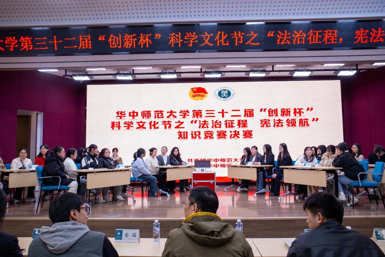 华大青年讯(通讯员 方向晨 雷语恬)宪法,是国家的根本大法,是治国安邦的总章程。在第十一个宪法日来临之际,为进一步弘扬宪法精神,维护宪法权威,推动全校形成尊崇宪法、学习宪法、遵守宪法、维护宪法、运用宪法的氛围,丰富同学们的宪法基本知识,12月8日,法学院开展华中师范大学第三十二届“创新杯”科学文化节之“法治征程,宪法领航”知识竞赛决赛。法学院党委副书记万枞、教育学院团委书记史磊、法学院团委书记张永基、法学院团委副书记何青苗、本科生辅导员姜孝文、研究生辅导员陈志超、校研究生会主席团成员李甜、校学生会主席团成员蒋妍出席活动。