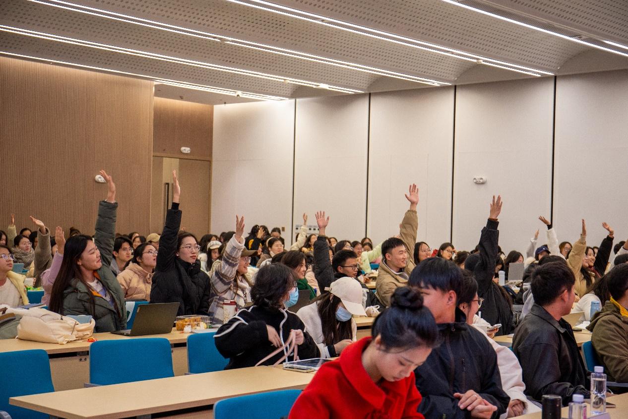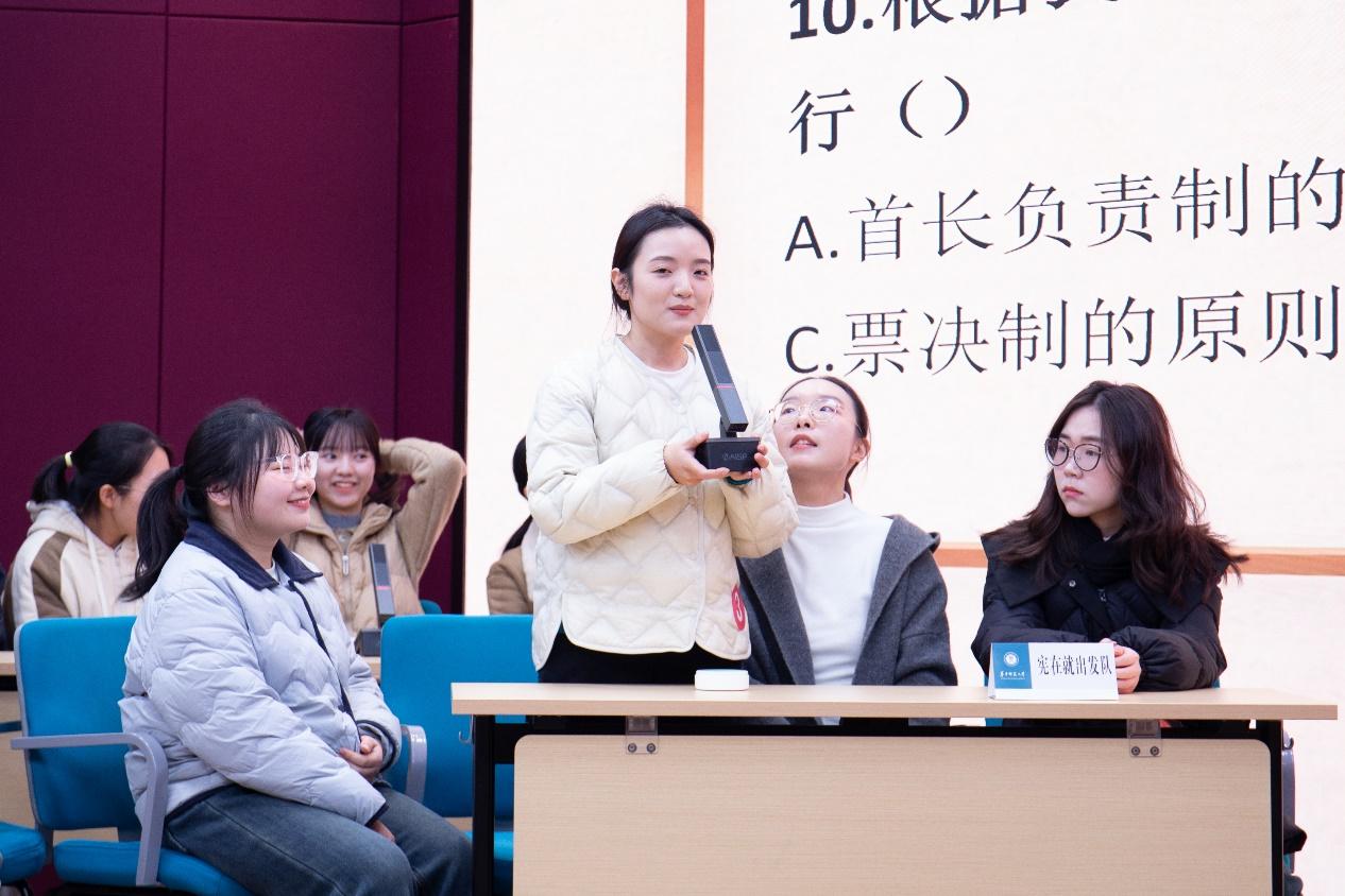 本赛制设置场外援助机会,选手在任意环节可以使用,邀请亲友团帮助本队回答问题。观众互动环节,现场随机抽取观众作答宪法有关的题目,答对便能赢取精美礼品,同学们踊跃举手,气氛十分热烈,大家都沉浸式体验在这场集知识性、教育性于一体的知识盛宴中。