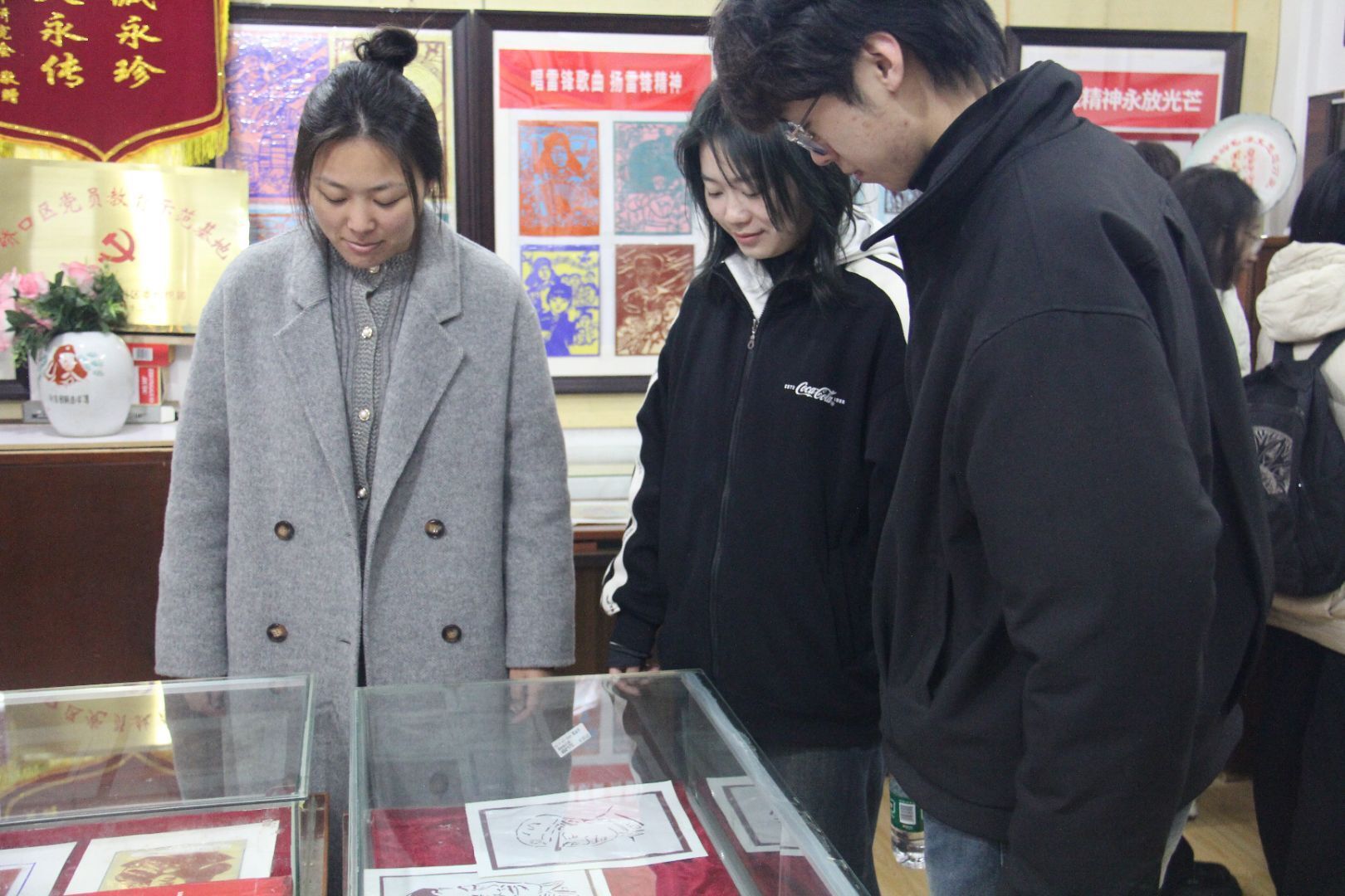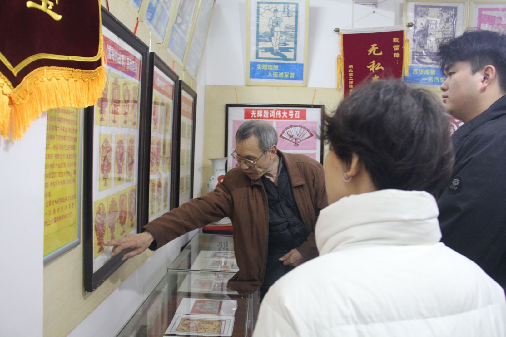 在众多展品中,一套《雷锋的故事》系列剪纸作品格外引人注目,给同学们留下极为深刻的印象。黄德宝讲到,该系列共计22幅作品,“22”这个数字恰好象征着雷锋年仅22岁却无比灿烂的生命。每一幅剪纸都以独特形状的扇子为造型,扇面内精心雕刻着雷锋不同人生阶段的故事与对应形象,涵盖“翻身解放”“少年先锋”“火热青春”“参军入伍”“助人为乐”等内容,完整勾勒出雷锋短暂却伟大的一生。同学们纷纷围聚在展柜前,被其精美的工艺和背后的动人故事深深触动。听完黄德宝的精彩讲解,大家怀着崇敬之情,认真参观每一件剪纸藏品,现场气氛十分活跃。黄德宝还分享了一些剪纸作品的独特之处与创作历程,让同学们对剪纸这一传统艺术形式有了更为深入的认识。