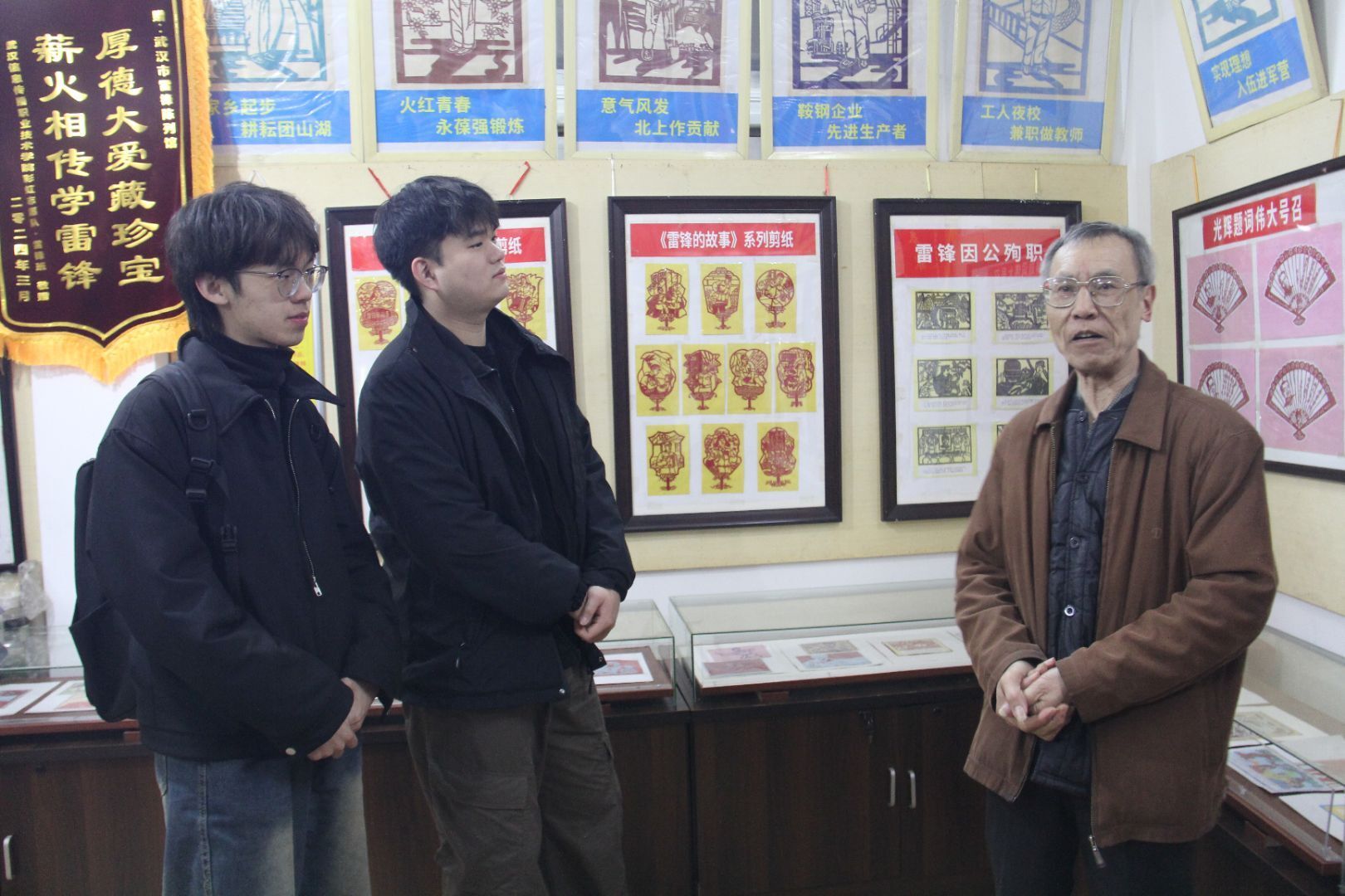 武汉雷锋陈列馆的创办者是有着70多年党龄的老党员黄德宝,他被誉为“湖北收藏雷锋第一人”。自中学时代起,黄德宝便对雷锋满怀敬仰,从此踏上四处搜寻雷锋相关物品的征程。2013年,在宗关街道井南社区的大力协助下,他成功在社区党员群众服务中心创办武汉雷锋陈列馆,并坚持将自己的珍贵雷锋藏品定期免费展出,让更多人有机会感受雷锋精神。此次法学院学子参观的雷锋系列剪纸作品展览,展品丰富、题材多元,从多个维度展现了雷锋的生平事迹与精神内涵。黄德宝满怀热忱,为同学们细致讲解展馆内的多幅剪纸展品,这些作品生动呈现出雷锋的信念力量、博爱情怀、忘我精神和进取锐气。