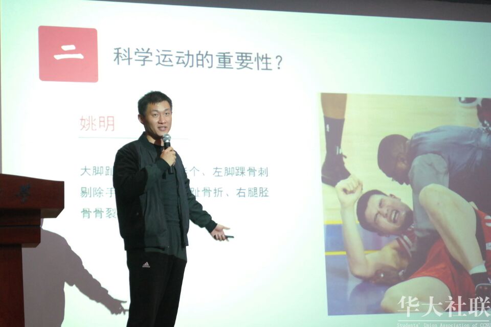 第一位主讲人王翔是武术协会指导老师,他从自己的亲身经历出发,引出科学运动与康复性体能训练的重要性以及常见运动疾病的处理方式。他介绍道,崴脚出血应当立即用冷水冲洗;抽筋最好的解决办法是按住小腿的同时拉大脚趾头或者坐下压住小腿并且翘起脚尖。当遇到肌肉拉伤时,应当冷敷,缓解后稍微运动。手腕关节不能动的时候需要做阻抗训练,或者在能活动的范围内尽可能多动。他还进一步列举出了刘翔和姚明的例子,总结了过度运动透支身体的危害性,鼓励大家运动的同时也要注意安全。