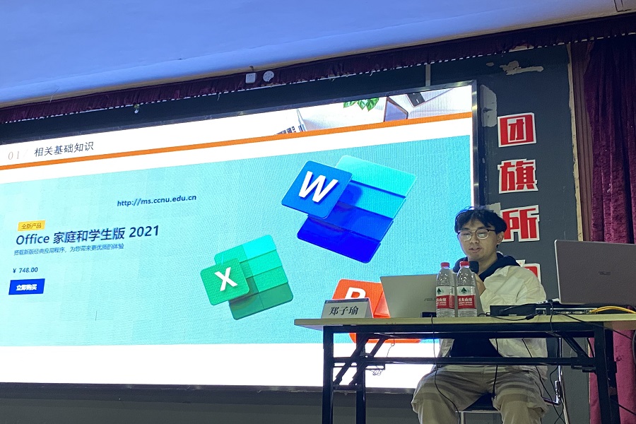开班仪式结束后,主讲人郑子瑜以“OFFICE三大件特训”为主题进行首次培训。他介绍了计算机常用文字处理软件及其文件格式、获取正版OFFICE软件的途径、计算机常用快捷键等基础知识。通过理论讲解、实例展示、互动提问等方式,郑子瑜针对Word、Excel、Power Point三种办公软件展开具体操作培训。郑子瑜以“如何在选课时快速筛选出自己想要查找的课程”为例,详细讲解了Word办公软件中的“查找”功能、“替换”功能及两者区别。在讲解如何运用Excel数据处理功能时,郑子瑜首先呈现出一个具体的成绩表格案例,向成员们逐步展示了如何使用各类函数处理表格中的数据。