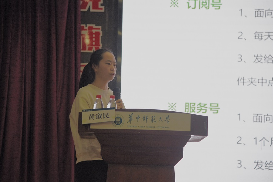 黄溆民以问题“为什么要学习微信公众号的运营?”为切入点,指出运营微信公众号对宣传工作的重要意义。为了加深大家对微信公众号的认识,黄溆民从定位和功能两方面入手,延伸出微信公众号的分类:服务号与订阅号,并详细介绍了两种公众号的区别。她还以事实为例,现身说法,详细介绍了华中师范大学官方微信公众号,指明其功能与意义。