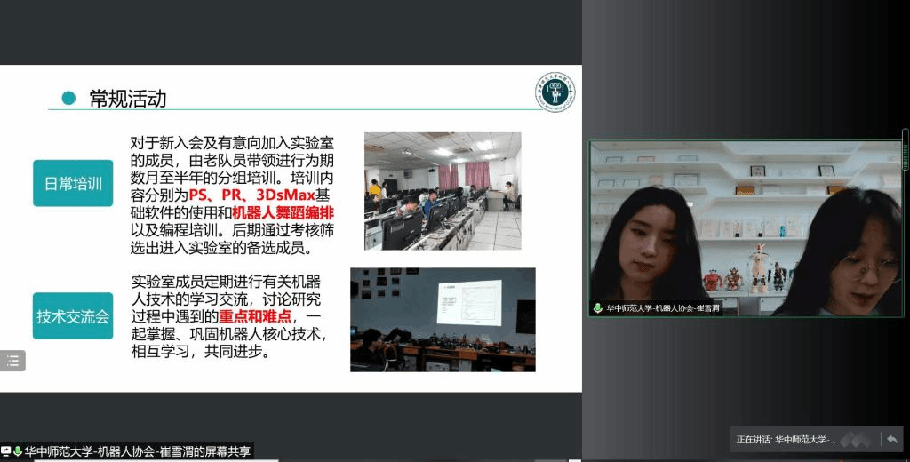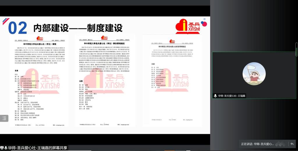 华中师范大学学生社团指导中心主任段雅芳在分享环节表示,中心着力夯实管理平台、第二课堂、实践平台和创新平台四个平台,推动多元融合共建。她在创新平台中强调中心部分育人措施,如开展薪火骨干培训计划,成立学生社团功能型团支部等。此外,华中师范大学的三个优秀学生社团代表南湖书画协会、圣兵爱心社和机器人协会也参与了本次经验交流,他们立足社团本身介绍社团的特色活动和工作成果,分享管理经验,展示社团风采。