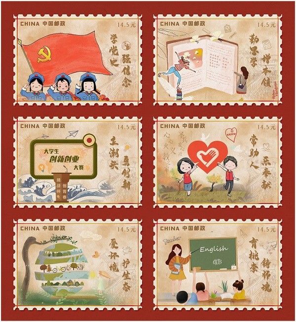 来自外国语学院的张美怡创作了“集邮——我的十四五”作品,通过设计邮票来体现自己的思考。每张邮票左上角的“14.5 元”寓意十四五时期,而六张邮票分别表达了她从六个方面展开的个人未来规划。来自新闻传播学院的周宇洁采用视频剪辑和配音的形式来展现十四五时期的个人规划,她表示:作为一名大一的学生,也正处于自己的迷茫期,所以借这个作品表达自己的思考与心声。来自外国语学院的焦点团队创作了《青春中国》英文自翻版朗诵作品,通过回顾新中国的历史,赞颂青年力量在中国历史上的卓越贡献,以表达对祖国的热爱和接续前辈青春力量、继续为祖国建设而奋斗的决心。