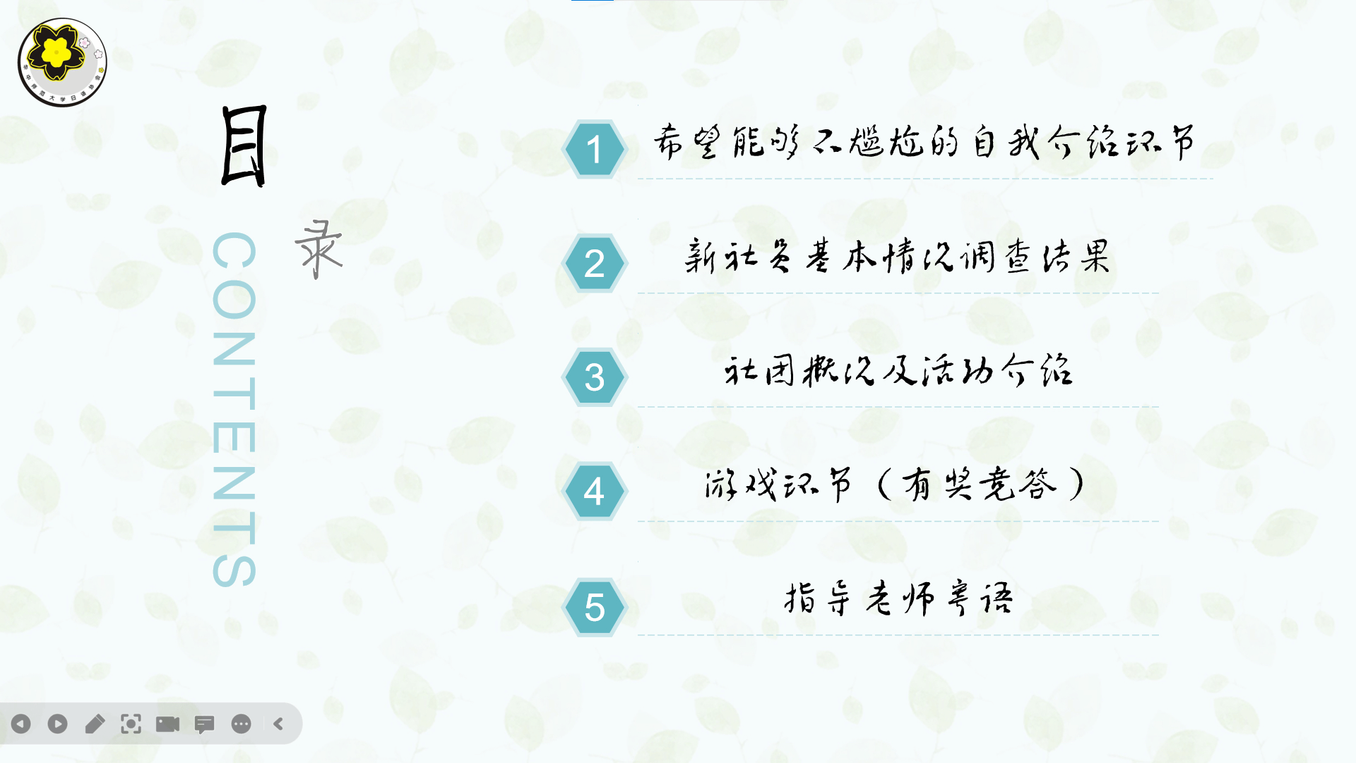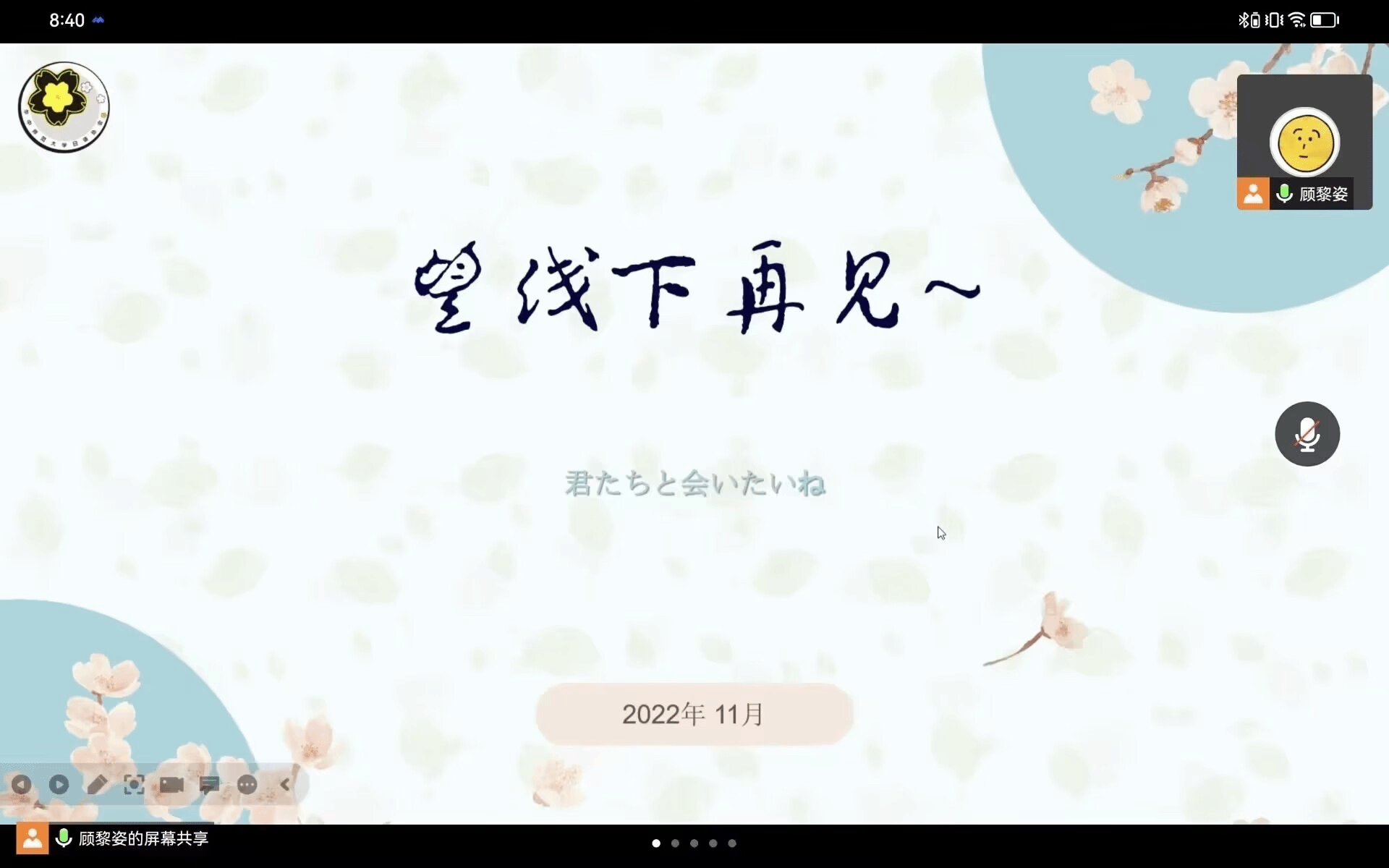 活动最后,顾黎姿播放了协会指导老师金玮婷的视频寄语。金玮婷对新会员们表示欢迎,并表示:“很遗憾不能和大家在线下相见,希望今后我们还可以在各类的活动中有更多的互动。”金玮婷分享了自己对于日语及日本的看法,认为日语是一门有意思的语言,日本也是一个具有多重性和多面性的有趣的国家。金玮婷希望全体会员能够在日协体验到学习日语的乐趣、结识志同道合的朋友,并期待日后与会员们在线下相见。