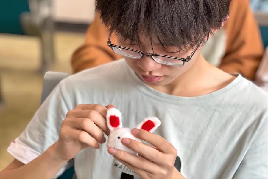 羊毛毡虽做法简单,却非常考验学习者的耐心。在自由创作初期,不少学生羊毛戳不成型。钟琪为他们提供技术指导,手把手示范教学,并指出初学羊毛毡不得要领是很正常的事,需要制作者放下烦躁,全身心投入。渐渐8205教室只剩下针戳羊毛的声音,每一位学生都专注于自己的作品,一刺一戳间将满腔热情凝聚成形。一个小时后,活动已近尾声,同学们的作品渐渐成型。活动的最后,师生集体捧着做好的毛毡兔合影留念。