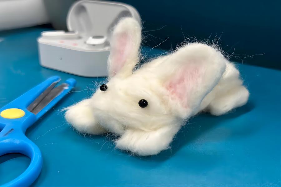 随后欧阳丽莎老师为同学们介绍羊毛毡的文化背景,并对活动要求与操作步骤作出补充讲解。她表示本次活动需要制作毛毡兔子,并指出羊毛毡虽为风靡国内外的手工界“宠儿”,在操作步骤上却并不复杂:首先需要备齐制作羊毛毡的工具,接着取适量羊毛卷成一个实心的羊毛滚筒,同时把两侧羊毛向内卷紧。随后用戳针固定尾端,使其形成一个软绵绵的羊毛球。完成该步骤后绕着球体向内深刺羊毛,同时不停滚动,使其成为一个光滑的圆球,直到羊毛变硬、不易变形。接着制作耳朵。取适量白色羊毛对折,然后戳成一个小方块,将顶部羊毛戳成圆弧,底部羊毛保持不变。将同样方法做成的粉橘色羊毛覆盖在白色羊毛上,用针浅戳实现结合。最后将做好的耳朵用针深刺固定在小球上,并戳上腮红,用胶水固定眼睛。如此一个羊毛毡小兔头就做好了。