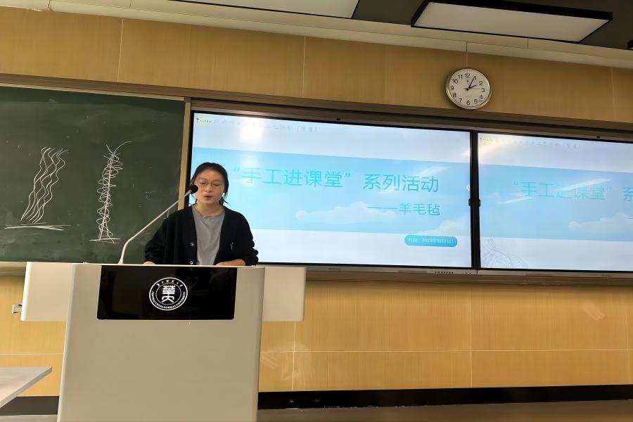 课代表马倩作简要开场发言,对手工艺协会与课程教师欧阳丽莎举办此次活动表示感谢。活动第二项,手工艺协会会长钟琪上台发言。钟琪为学生介绍手工艺协会,讲述协会的发展历程与成就,带领他们一起回顾协会曾举办的羊毛毡活动盛况,并展示部分作品成果图,引起了在座学生对羊毛毡手工的兴趣。