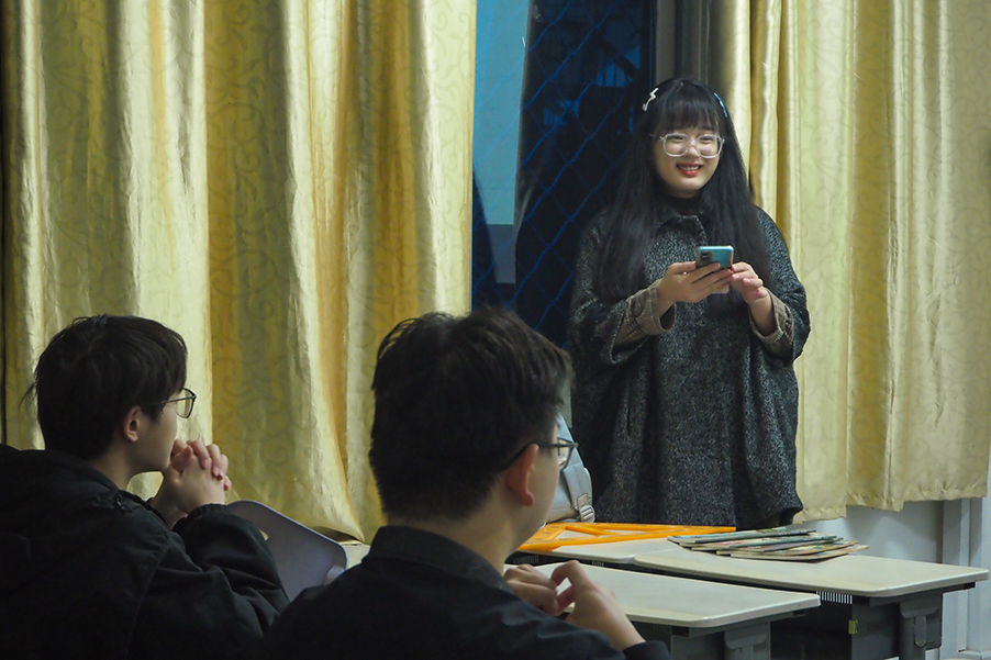 随后,陈喆分析了会员的日语水平以及加入日语协会的原因。新会员中,零基础或对日语了解较少的成员占比相当高,他们主要因为对日语学习和日本动漫的浓厚兴趣而选择加入日语协会。之后,陈喆引导在场会员进入游戏环节,其中包括听歌曲猜歌名以及看解释猜日语流行语两个环节,答题奖励为一番日本语杂志一本。三首歌曲《心理作用》《红莲华》以及《没什么大不了》一经播放出前奏,便引发了新老会员的积极回应。尽管接下来的日语流行语部分难度增加,但是通过主持人的提示与会员们的讨论,答题环节顺利进行。