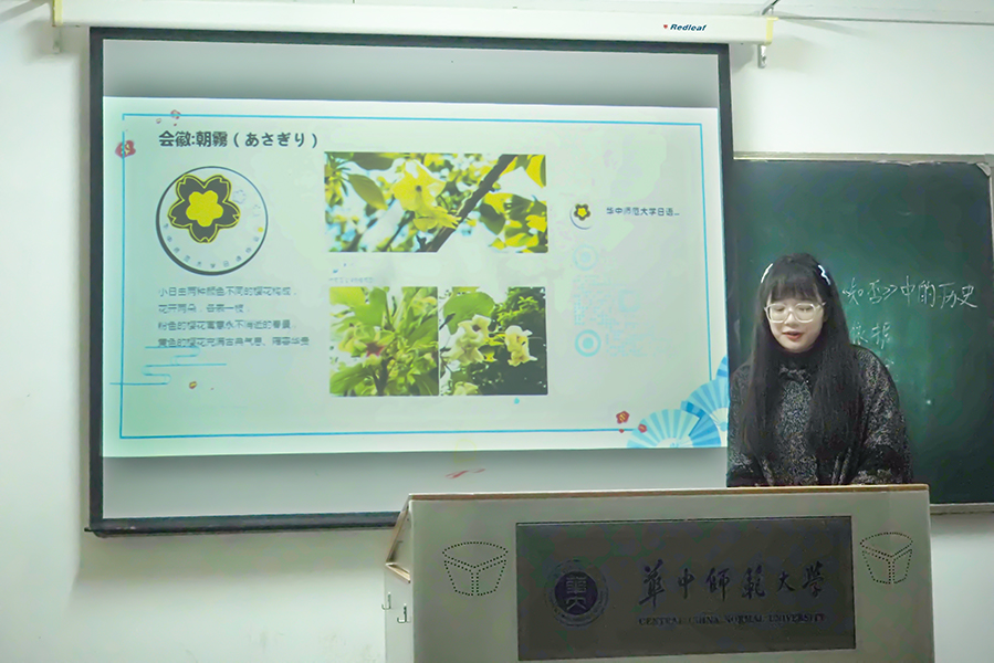 大会伊始,陈喆向全体在场会员表示欢迎。她以日语协会的历史发展为切入点,向在场会员介绍社团基本信息和日语协会形象——朝雾酱的由来,并对日语协会会徽的设计理念进行解读。
