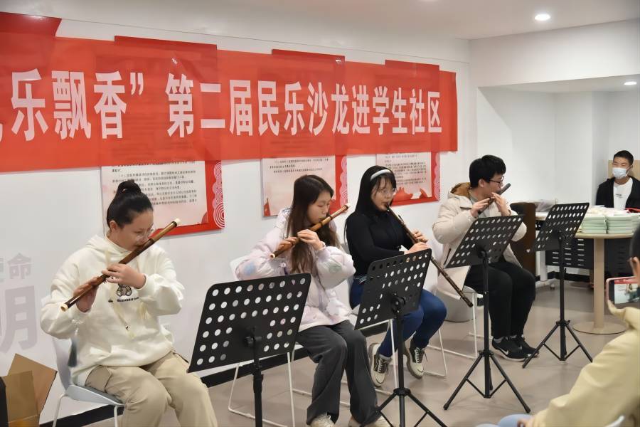 一手持弓,一手扶杆,二胡演奏者以悠扬琴声演绎《兰亭序》。笛箫演奏者以高超技巧将《春不晚》《知否》展现得淋漓尽致。阮艺协会的柳琴表演将现场同学拉入文化长河,使其沉浸于婉转悠扬的曲艺之中。人工智能教育学部2022级郝金硕同学说道:“我觉得民乐沙龙活动举办得很成功。活动不仅有现场民乐演奏,还把民乐和我们喜欢的流行曲结合在一起,真的令人惊叹!”协会的精彩演奏让现场观众陶醉其中,展示了民俗音乐的魅力。