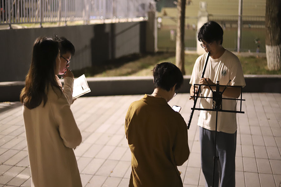 在演奏的过程当中,裁判们也给出选手相应的建议以及指导。大部分成员都能稳定清晰地完成长音演奏,少部分同学的音阶演奏较为生疏,不够连贯。在自选曲目考核中,除了协会指导老师娄策群在大课上教授的曲目《茉莉花》,有多位选手演奏了自己准备的曲目,例如《飞雪玉花》《大鱼》等。其中箫组的两位同学都选择了《飞雪玉花》,箫声悠扬,古风韵味在电影场铺展开来。整体来说,裁判组认为成员们共同的不足都是音不太稳定和准确,但是能看出大家在课后的用心练习。