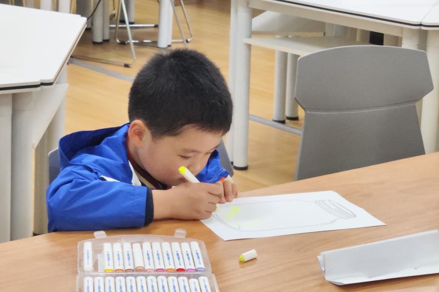 阅读完绘本后,老师让孩子们领取属于自己的情绪瓶子卡片,挥动画笔,学习用色彩来表达自己的情绪。有的孩子在瓶子里画上了彩色的圆圈,有的孩子将代表快乐的颜色涂满了整个瓶子。孩子们在老师的邀请下纷纷上台展示了自己的“情绪瓶子”。