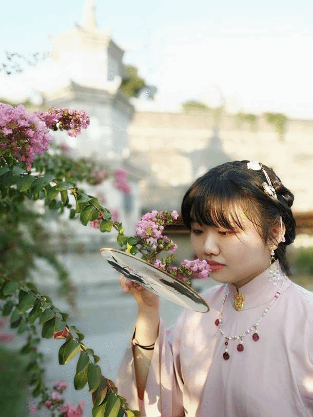 一袭长衫半袖,盈身立于世间;一柄团扇微颤,半遮如玉娇颜。在汉服中,最得杨昕晔喜爱的是宋制汉服,对襟长衫,宋抹和百迭裙。罗衣何飘飘,轻裾随风还。于她来言,身穿汉服就像平常的呼吸一样,代表着热爱与自由。当然,对于平常自己的定位,她亦会半开玩笑地说,自己其实爱好不多,闲时喜欢看书弹琴,研究服饰,说起来自己算是一个伪文艺女青年吧。