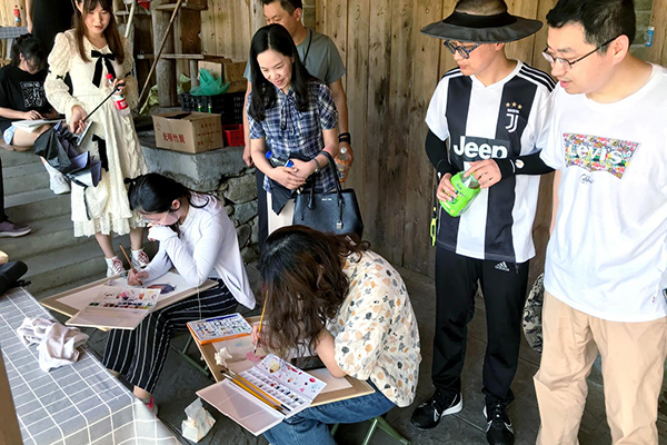 第二天一早,罗书记便进入了瑶里古村,实地了解了学生的写生实践情况,检验了同学们的写生实践成果。各位同学在村内的各个角落里摆好画具,在谭政和王翔两位老师的指导下尽情描绘这片乡村美景。自然山水之风光、民风民俗之淳朴皆跃然于画纸上。