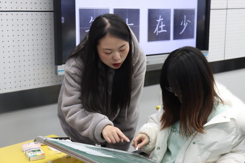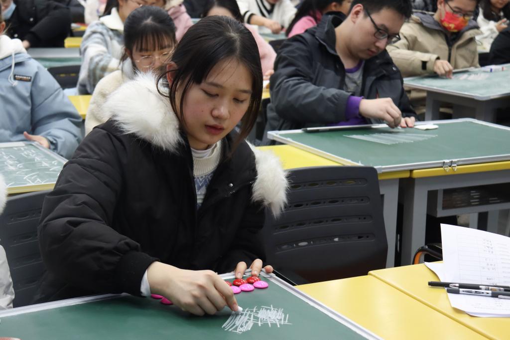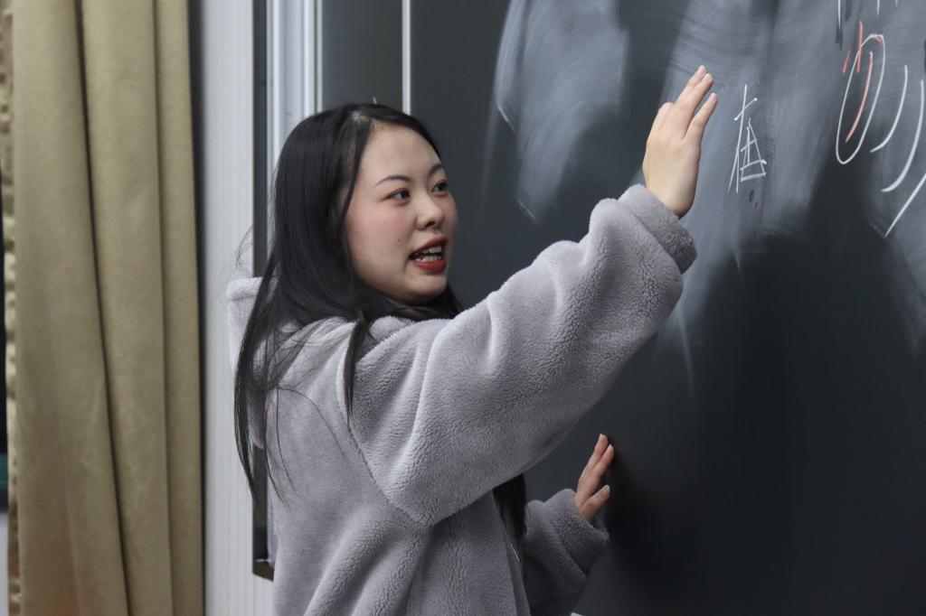 除了对粉笔楷书书法技巧的讲解,陈诺还在同学们练习时认真观察每个人的书写,针对不足之处给予建议,使同学们的书写得到进步,书写能力得到提高,同时,她也不忘适时鼓励、夸奖大家,增强同学们的信心,使大家更积极热情地投身到粉笔字的学习当中。