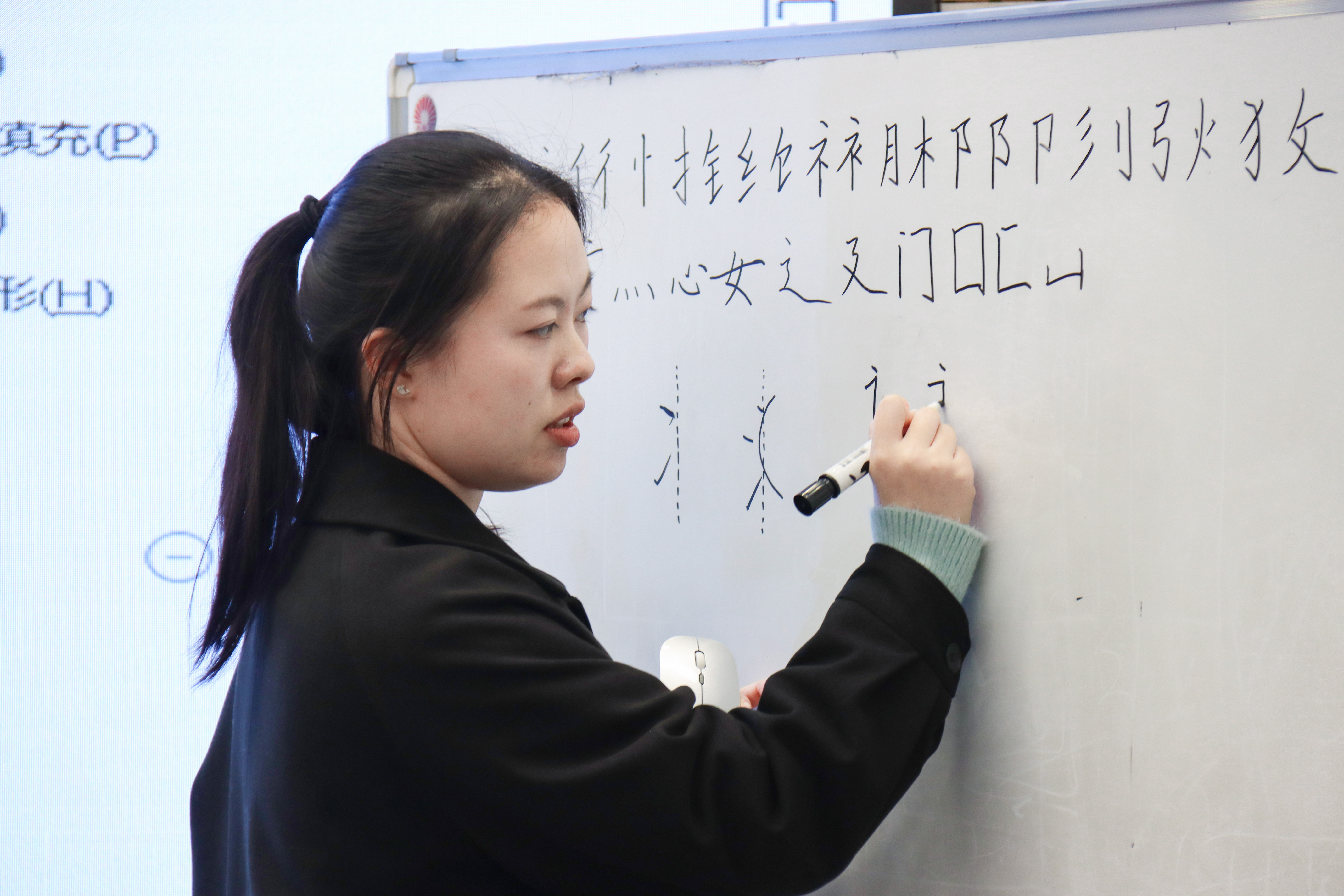 活动开始,陈诺先点明了偏旁部首的书写要领,并且附上对偏旁写法的简要概括,强调其特点,如金字旁需“横画等距,竖落偏左”,提手旁则是“右对齐,竖画直挺”。精炼的特点总结后,为帮助师范生们更快掌握偏旁书写通用技巧,陈诺对单人旁和双人旁、两点水和三点水等相似偏旁进行了归纳讲解,利用汉字书法独有的相通性和差异性,让学员们在准确掌握偏旁部首书写规律的同时也体验到了中国书法背后所蕴含的智慧。