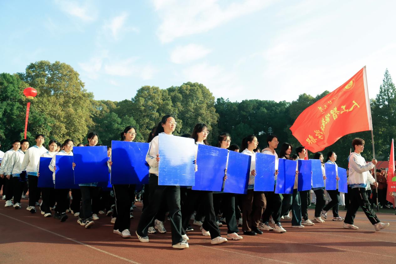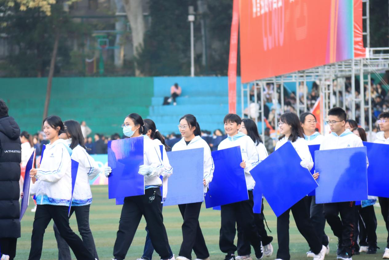一曲舞毕,方阵成员向全校展示了独具学部特色的科技感旗帜,伴随着嘹亮的口号声有序入场。各方代表人致辞结束后,运动员们投身到了积极的准备活动中。在志愿者等工作人员的带领下,进入项目检录场地,开展热身活动,为接下来的比赛做好准备。看台上的学生挥舞着手中的学部应援牌,为运动员们鼓舞士气,加油呐喊。