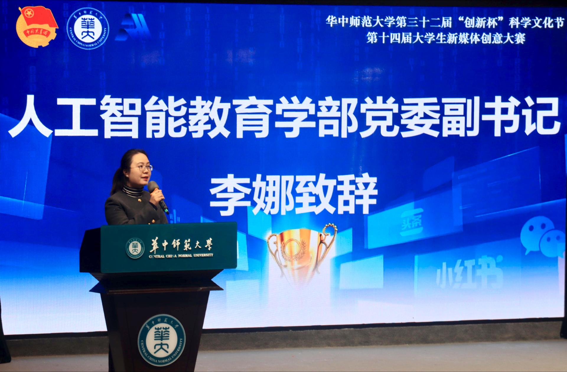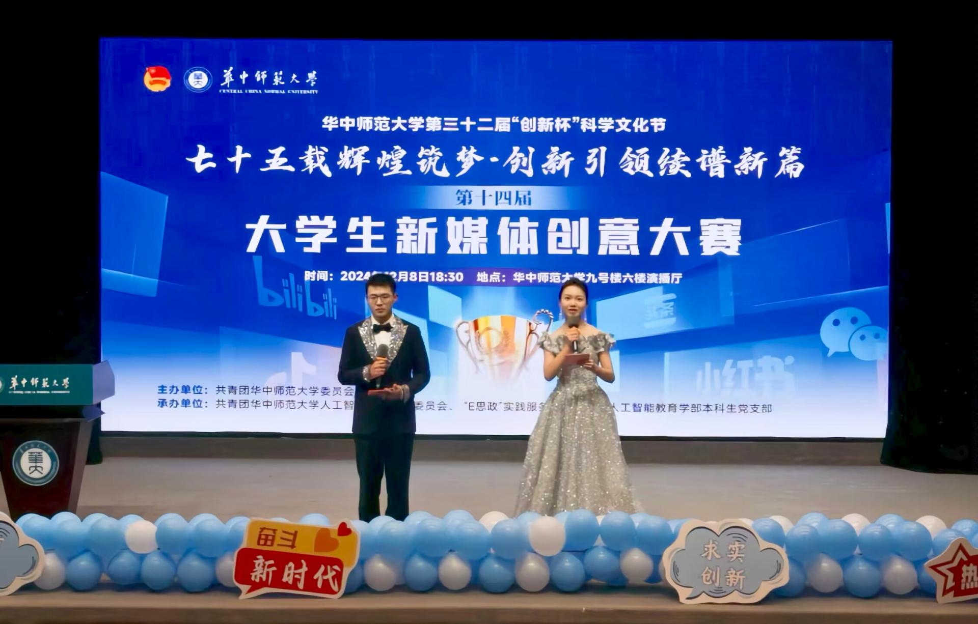 华大青年讯(通讯员 熊诗宇 张浩天)为深入学习贯彻习近平新时代中国特色社会主义思想,庆祝中华人民共和国成立75周年,展现学校“五育并举”育人成效,激发青年学子在新媒体领域的创新活力,12月8日晚,由共青团华中师范大学委员会主办、人工智能教育学部承办的第三十二届“创新杯”科学文化节之“七十五载辉煌筑梦,创新引领续谱新篇”第十四届新媒体创意大赛决赛及颁奖典礼,在九号楼六楼演播厅举行。出席决赛的嘉宾有人工智能教育学部党委副书记李娜,校团委学生副书记杨天卓,生命科学学院团委书记徐晨阳,人工智能教育学部团委书记任嘉航。人工智能教育学部陈迪、王志峰,美术学院李子健担任决赛评委。