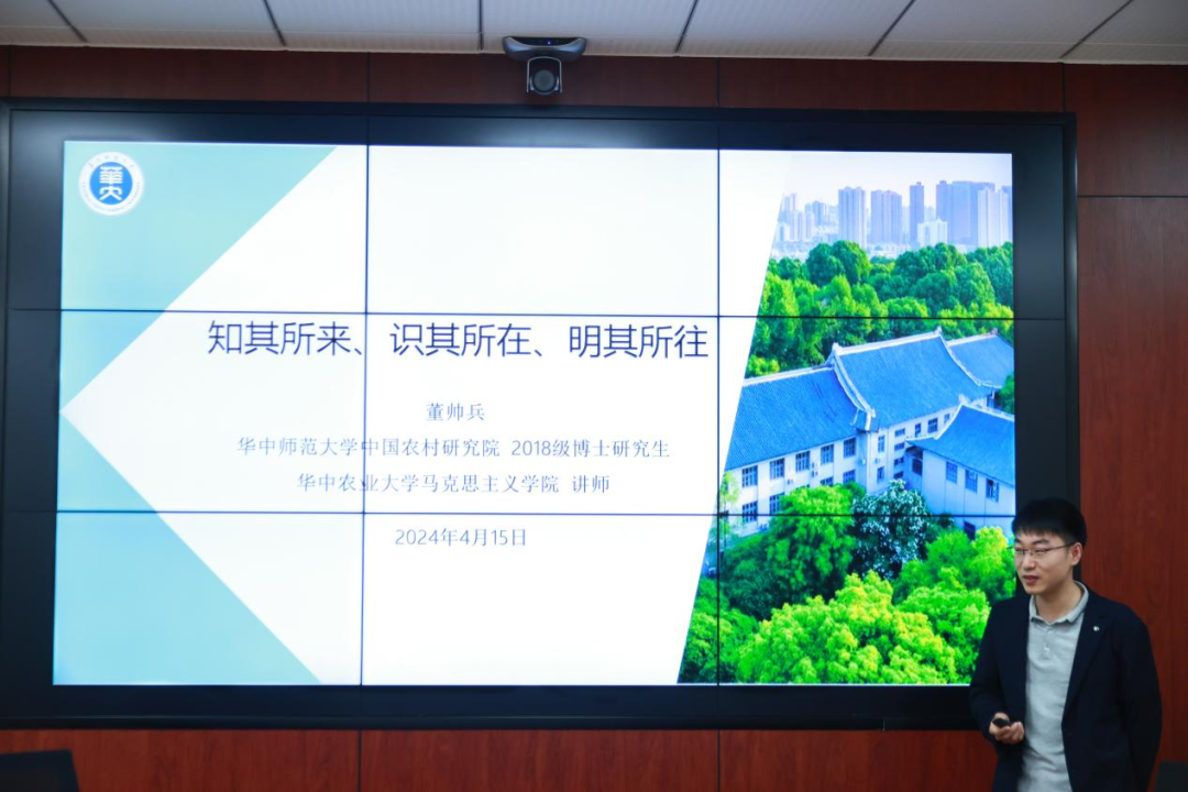 华大青年讯(通讯员 侯小蒙 蓝希华 姚瑾)4月15日下午,为积极践行“有温度的教育”,做好2024届毕业生求职就业工作,中国农村研究院(以下简称“中农”)在文科科研楼南楼720会议室举办第6期“博言博语”博士生下午茶活动。活动以“博士毕业,何去何从?”为主题,邀请了中农2020届优秀博士毕业生、华中农业大学马克思主义学院讲师董帅兵做主题分享。中农党委副书记马珺、辅导员龙凤翔和20余名研究生代表参会,龙凤翔主持活动。