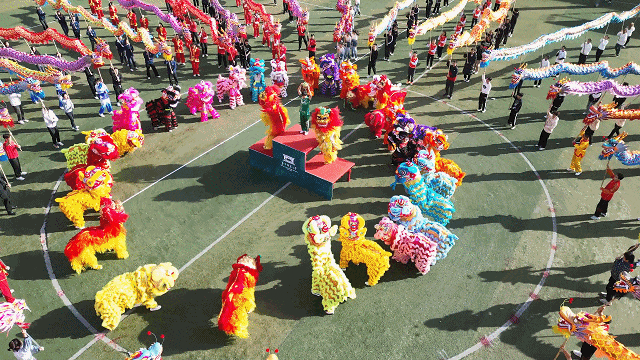 随着两只威武的狮子越入场中,摇头摆尾大展拳脚,团体操舞龙舞狮表演拉开序幕。身着红色或黑色服装的舞者扛起龙身,迈着整齐的步伐,让一条条色彩斑斓的巨龙遨游天际。大龙静有神威,小龙动若流云,场上群龙共舞。众狮憨态可掬,穿梭其间。体育场上色彩缤纷,华师学子神采飞扬。