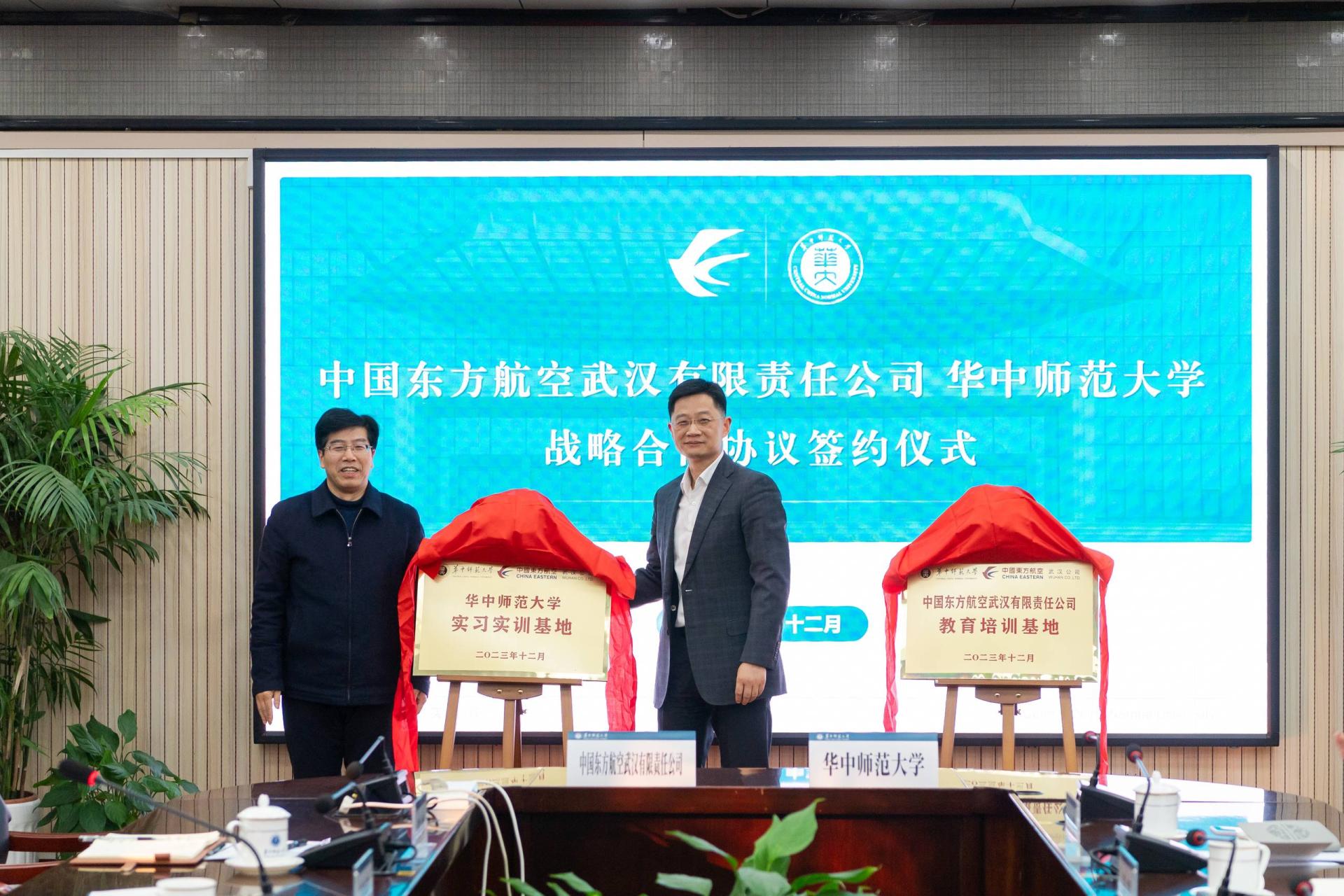 李良斌与彭双阶代表双方单位为中国东方航空武汉有限责任公司教育培训基地、华中师范大学实习实训基地揭牌。