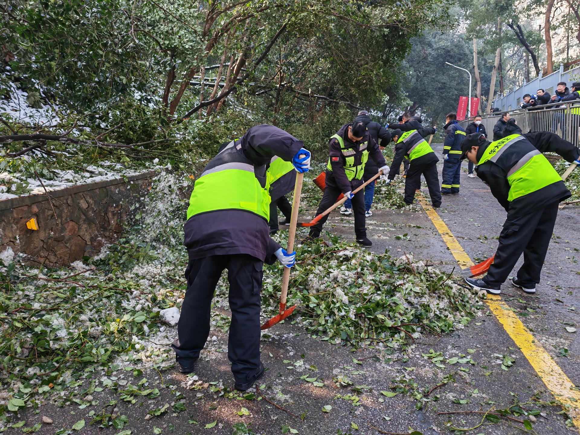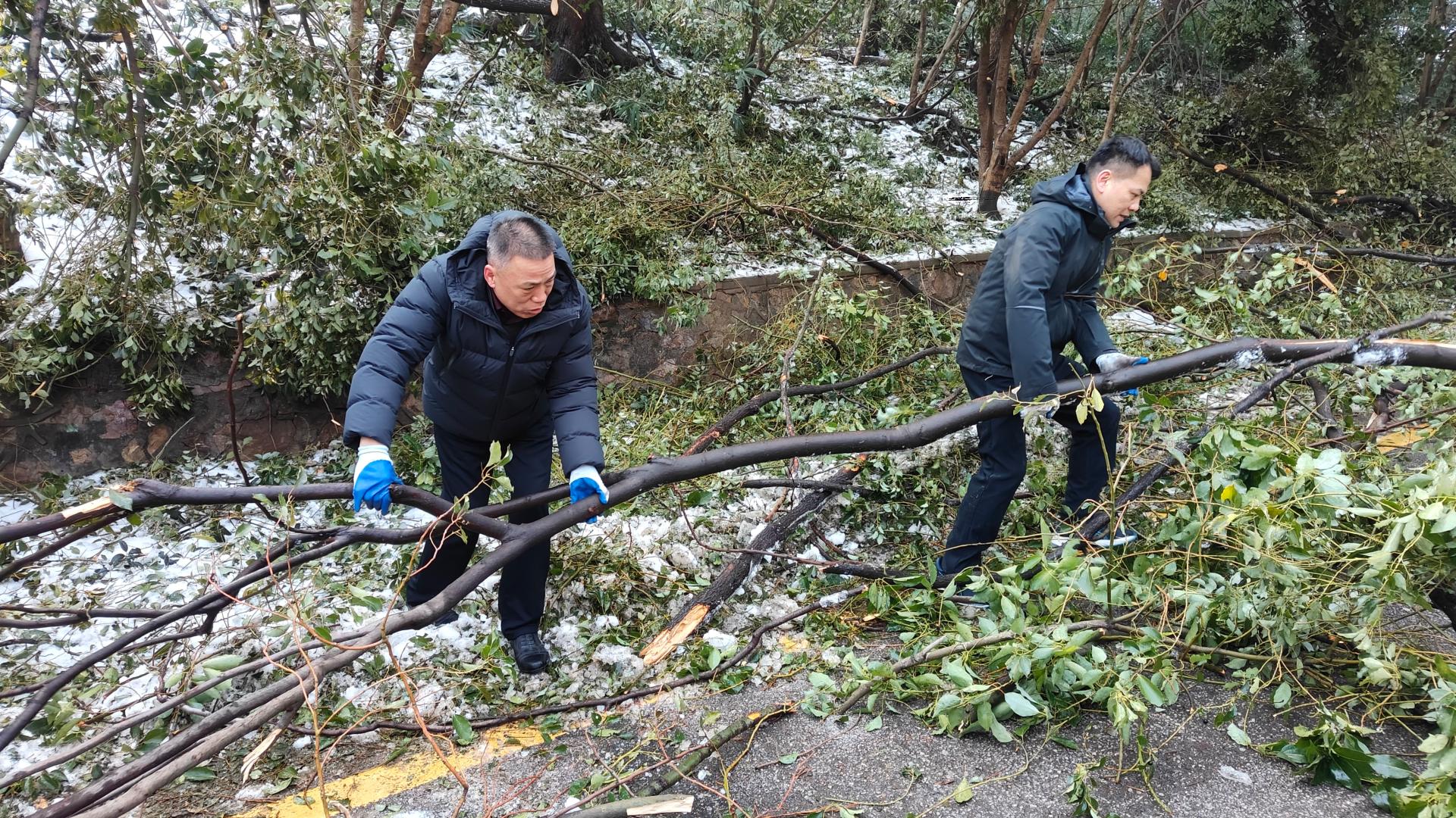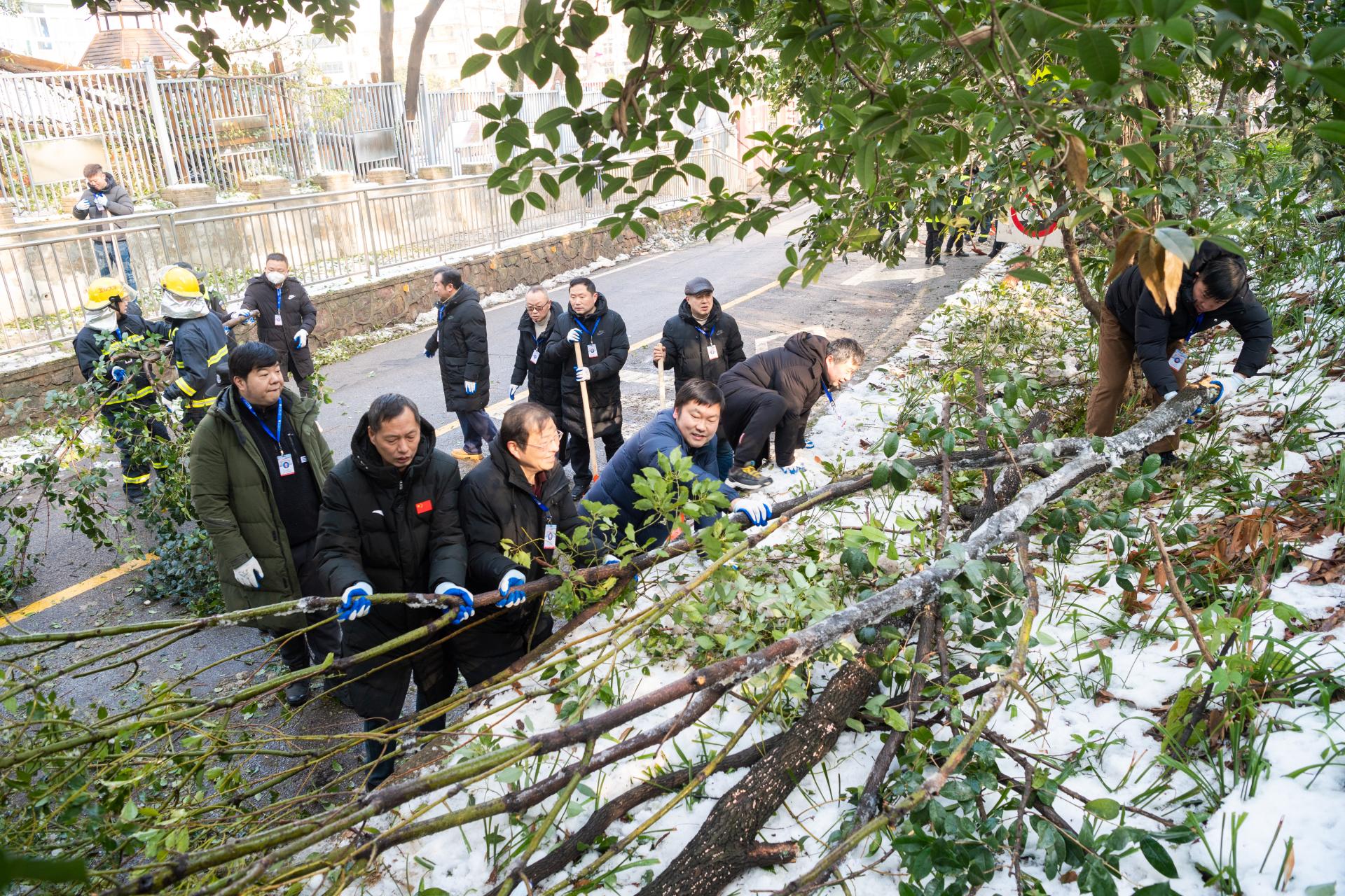 华大在线讯(通讯员 高珊)受此前低温雨雪天气影响,校园有大量被积雪压垮折断的树干树枝需要清理。2月9日上午,保卫部(处)党支部开展“除夕我在岗,守护不打烊”支部特色活动,号召在汉党员及志愿者来校清理断枝,确保师生居民出行平安。校党委副书记、纪委书记刘继文参加本次支部活动。