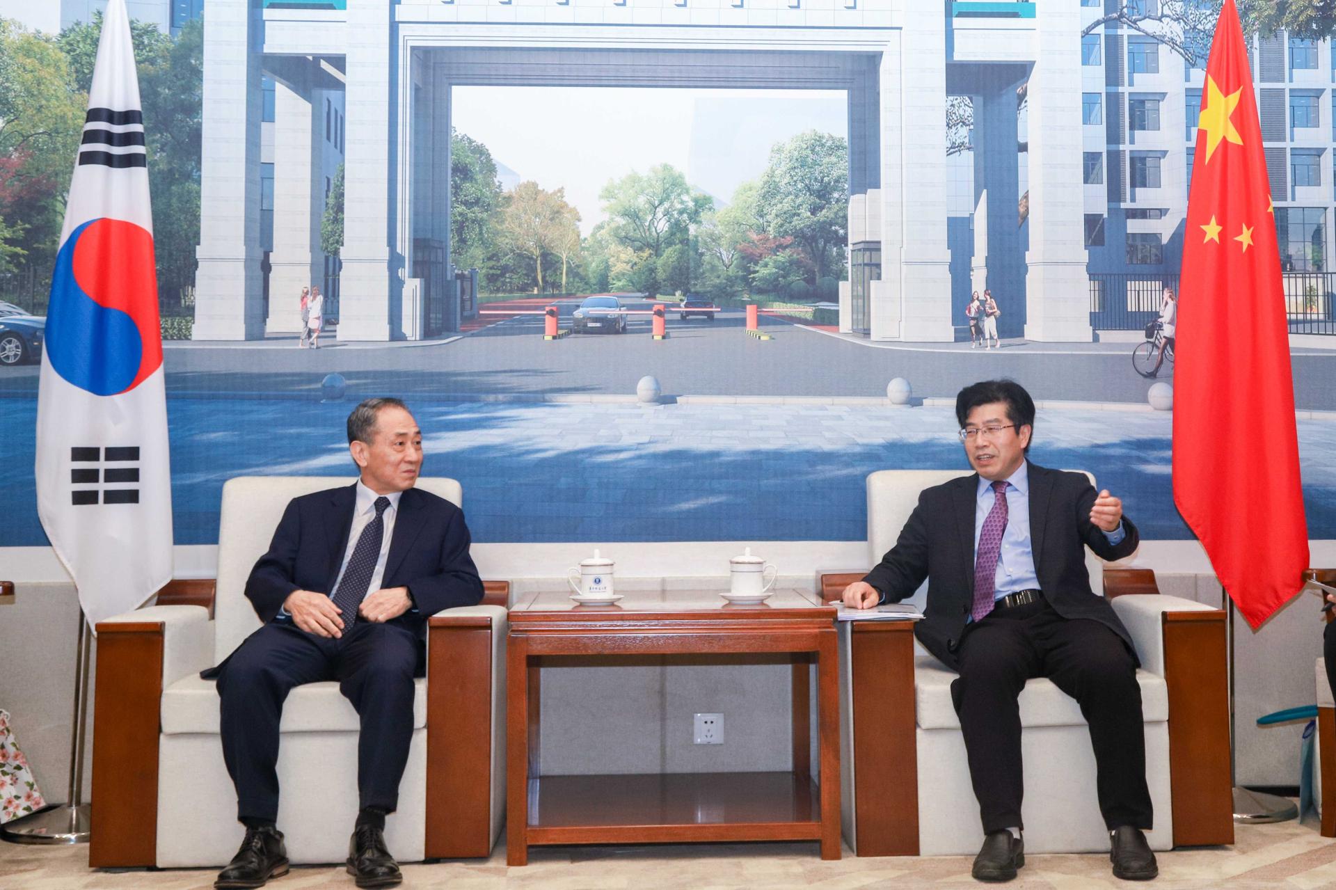 彭双阶对河成柱一行来访表示热烈欢迎。他向来宾介绍了学校办学情况,并分享了学校在数字化和开放化方面的举措和成效。他表示,学校不断推进大数据、人工智能等信息技术与教育的深度融合,取得突出的成就,成为中国教育信息化领域的旗帜和标兵。我校是湖北省唯一一所具备本硕博多层次韩国语人才培养体系的高校,对韩国交流广泛深入,希望在韩国驻武汉总领事馆的支持下,进一步拓展对韩交流,与更多韩国高校开展更加深入合作,为增进中韩两国教育文化交流做出更大贡献。