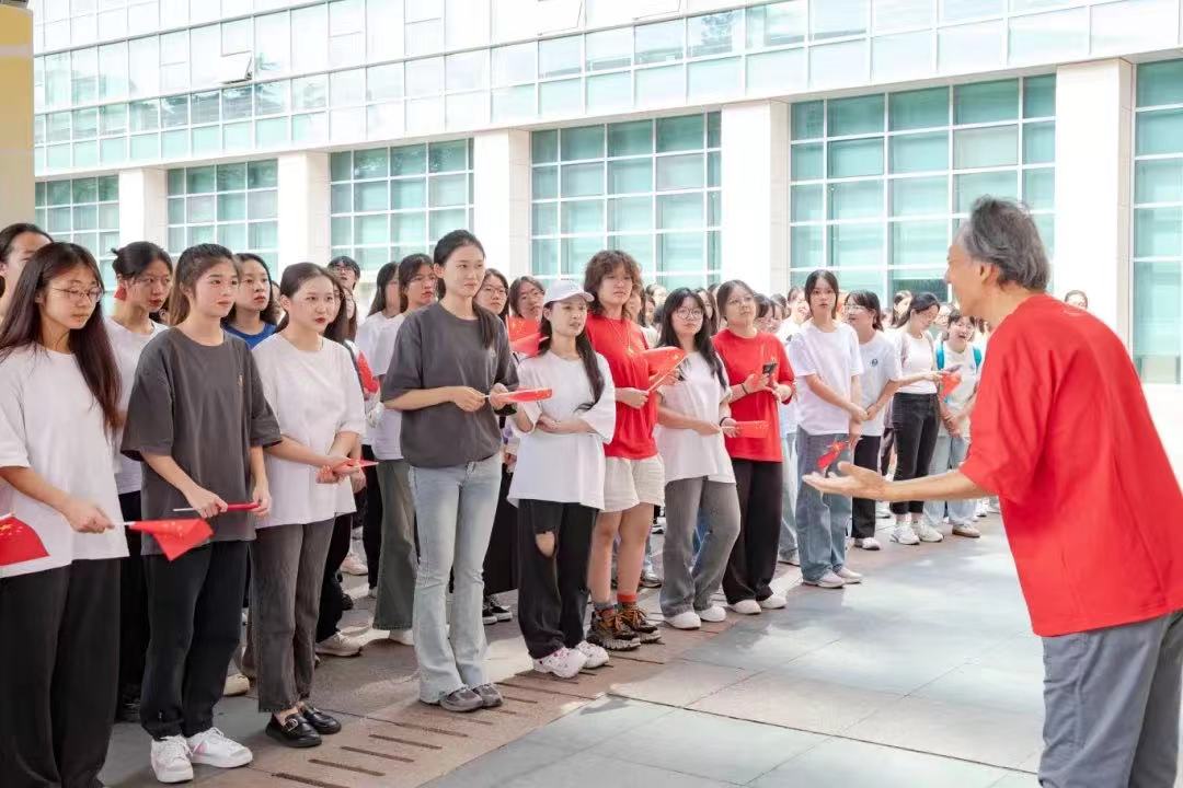 活动伊始,在音乐学院田晓宝教授指挥下,Tiankong合唱团和百余名学生志愿者在图书馆门前分成四个方阵,一曲《我的祖国》拉开了此次活动的帷幕。合唱成员们边歌唱边挥舞国旗,一齐向图书馆门口缓缓汇合。多个声部的歌声此起彼伏,富有层次的歌声带着现场观众飞越壮丽山河,广袤的大地、翻滚的麦浪和流淌的江河好似跃然眼前。嘹亮的青春之声满怀对祖国的热爱与祝福。