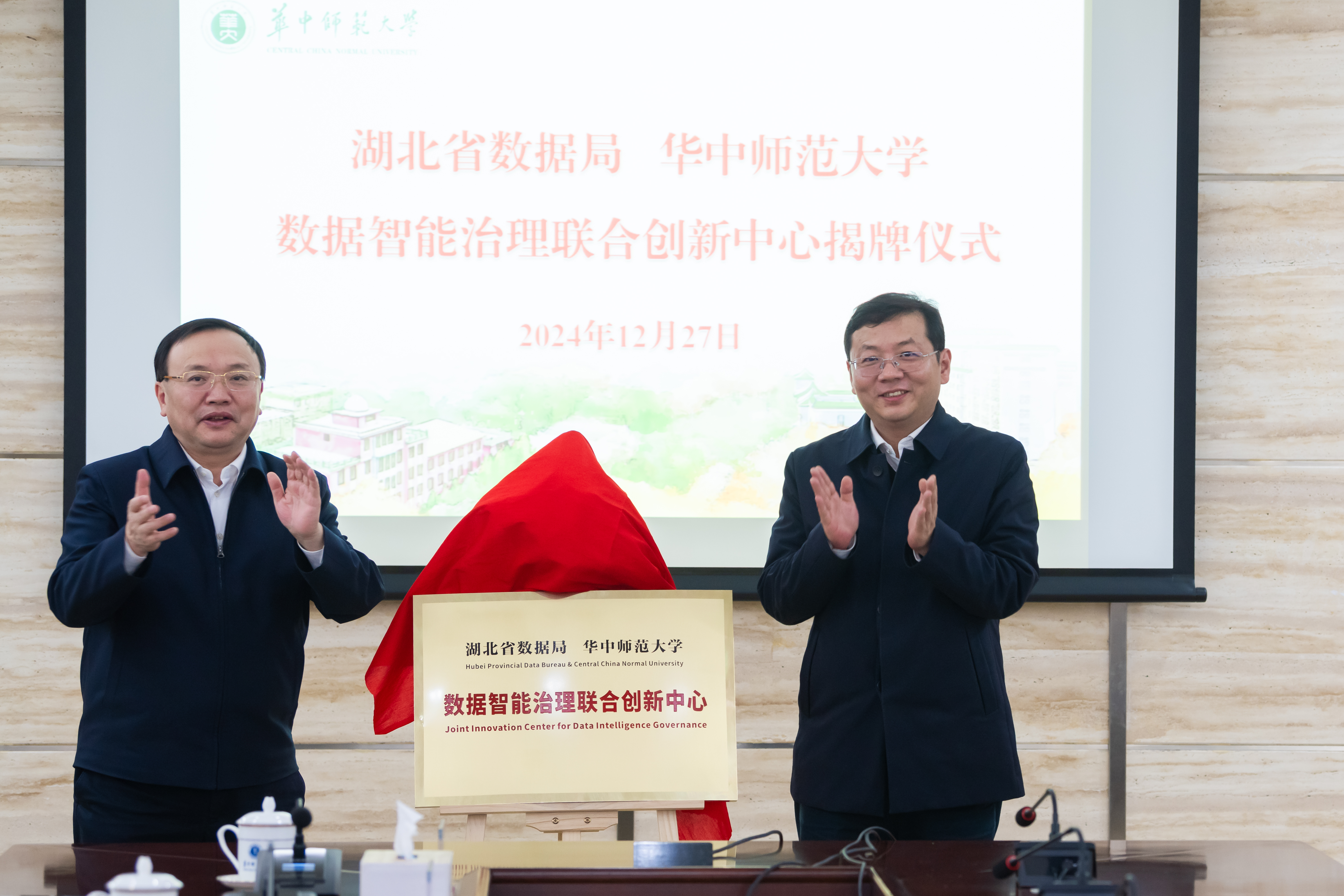华大在线讯(通讯员 尚潇雨 焦海涯)12月27日,湖北省数据局—华中师范大学数据智能治理联合创新中心揭牌仪式在科学会堂举行。湖北省数据局党组书记、局长周森锋,校党委书记夏立新,校党委副书记陈迪明出席揭牌仪式。陈迪明主持揭牌仪式。