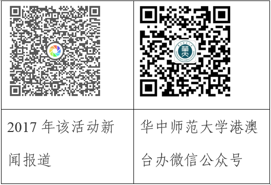 3.该活动往年有关报道可扫描下方二维码了解,也可参阅“华中师范大学港澳台办”微信公众号或港澳台办网站hmt.ccnu.edu.cn。关于2018年活动详情可咨询国际处(港澳台办)汪亭亭老师、校团委陶力老师。