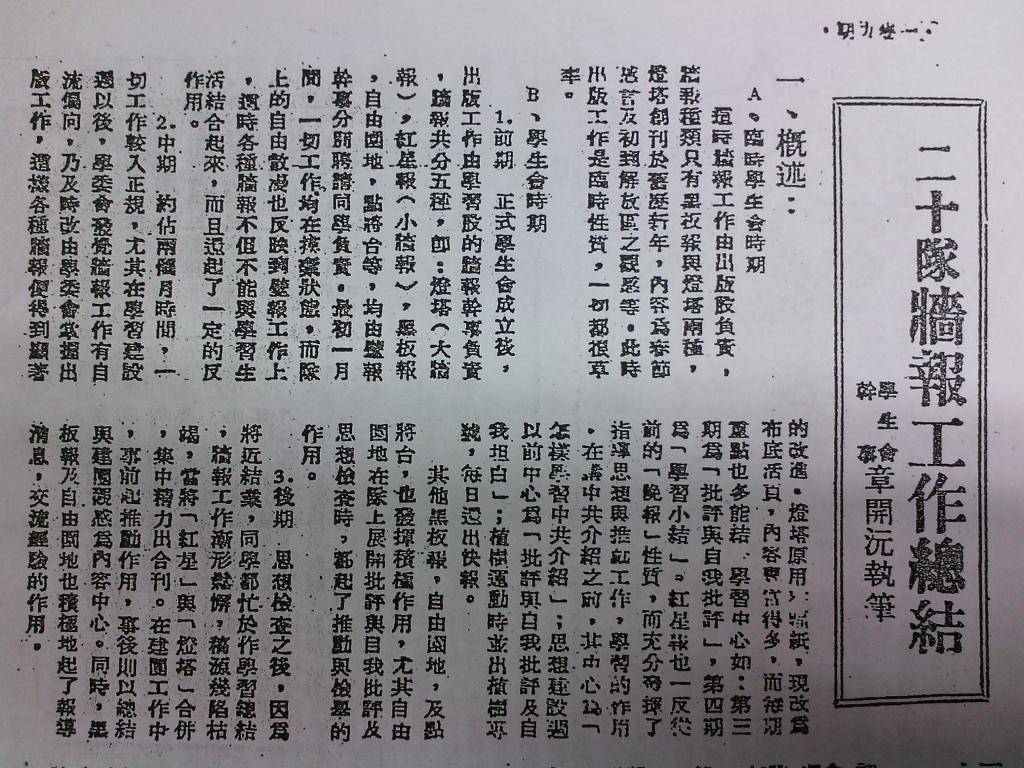 在一次小组讨论上,第20队(不是我在的那个小组)一个来自中央政治大学的叫做黄贲的同学发言,认为马克思主义不但要认识世界,还要改造世界,这是非常好的,问题是,马克思主义把人类社会分成五种形态,这是不是一种教条或者图谱呢?他的发言在小组内引发了讨论,也引起队上领导的重视。牟政找到我,对我讲:“学员中怀疑马克思主义的情况似乎比较普遍,需要作一些引导。你从中学起就办墙报,能否就此事办一期?最好不要用批判的方式,而是用讨论的方式,引导大家正确认识马克思主义,文章以短小精干为主。”